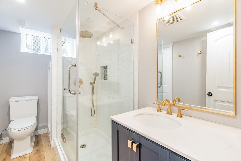 - Deep-toned vanitytopped with a cultured quartzcountertop and finished with brushed gold fixtures