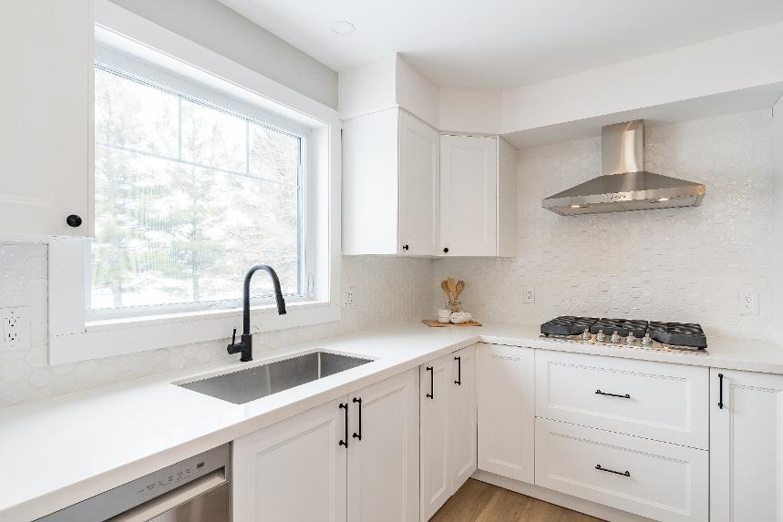 - Wealth of whitecabinetrycomplemented by blackhardware and a textured hex-tile backsplash