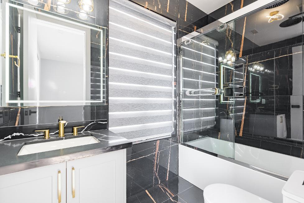- Oversized windowwith motorized zebra blindsforadded privacy