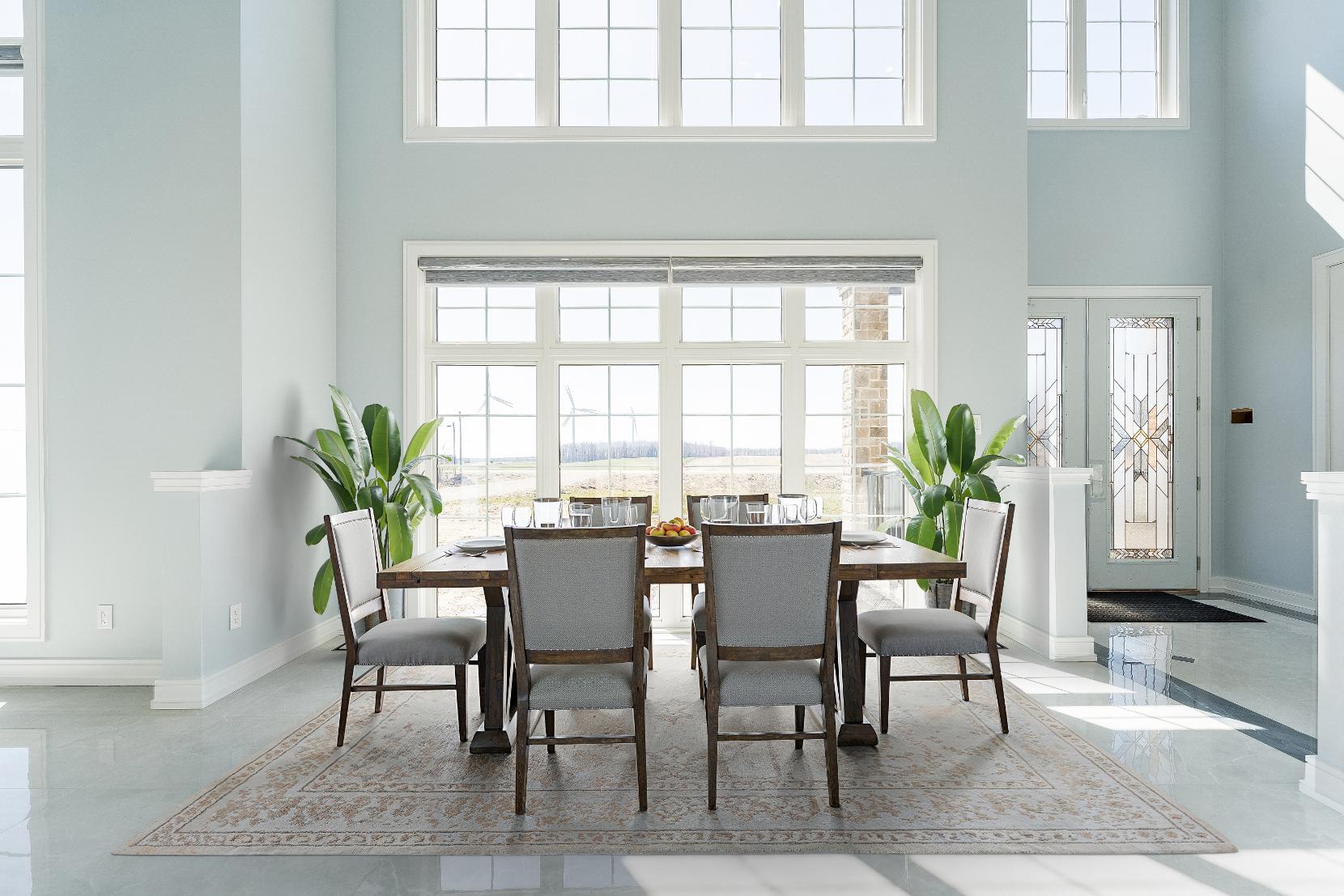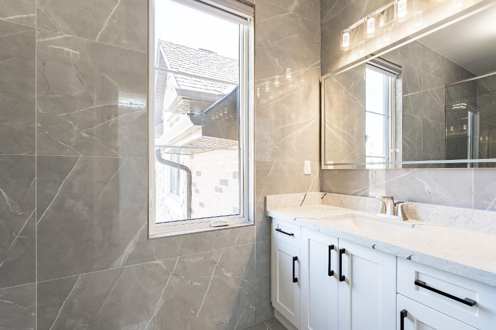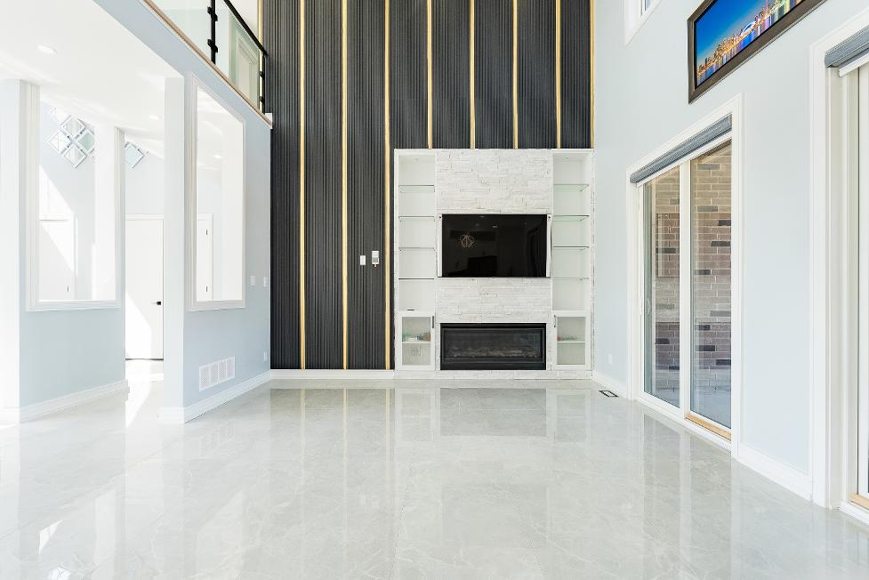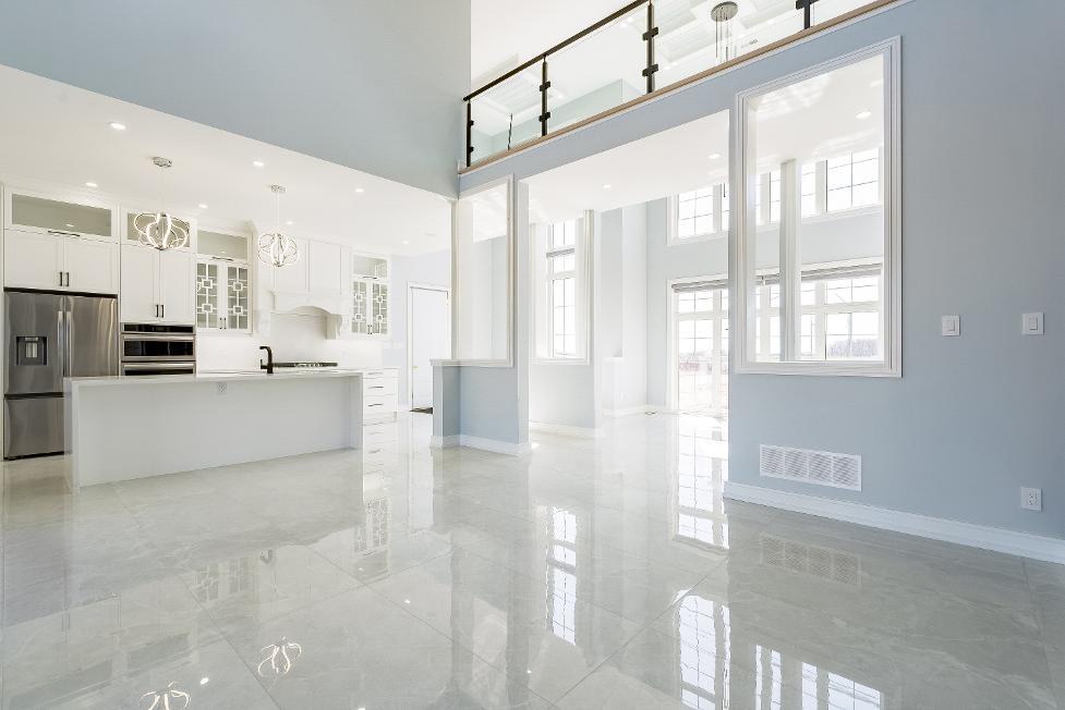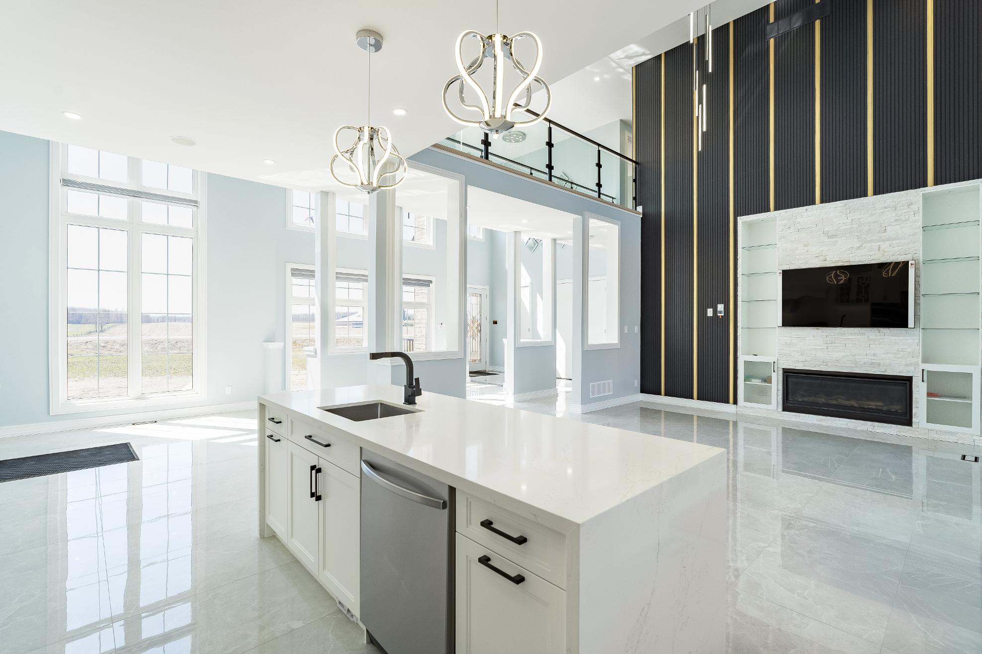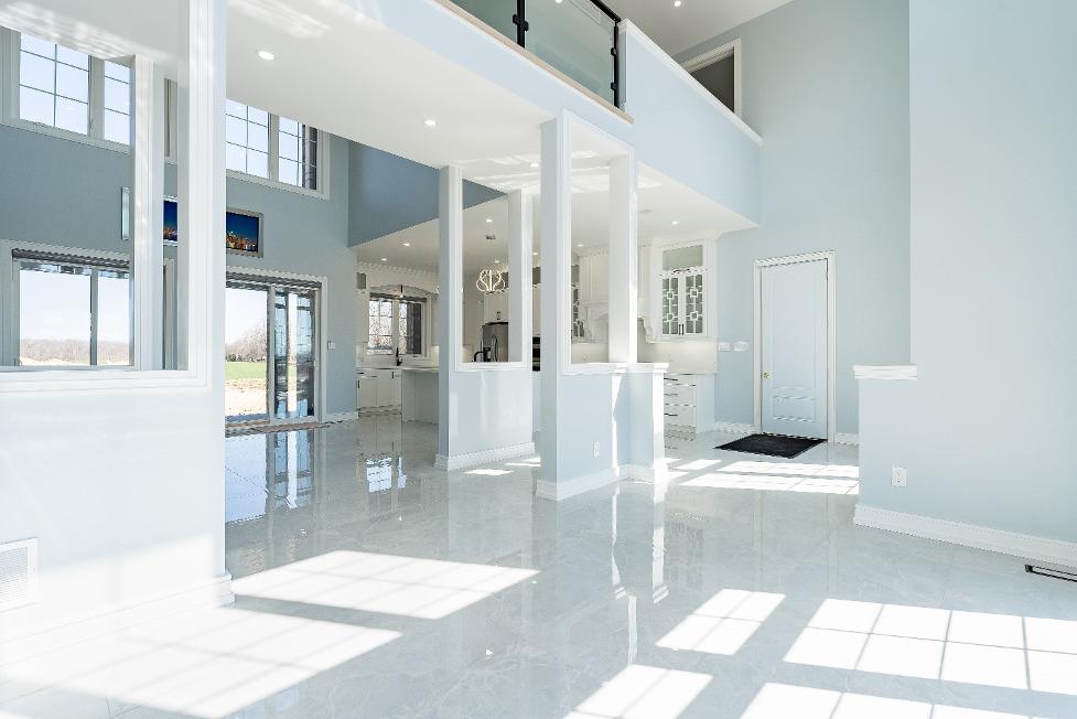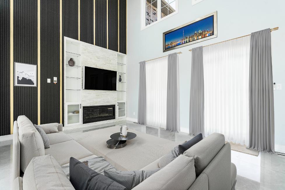 Grand interiordesign with refined finishesisshowcased from the moment youenter,with soaring 24'ceilings,expansive windows,and an abundanceof naturallight,complemented by24"x48"porcelain tilesand a seamlessopen-concept layout that flowsinto a chef's kitchen with a quartzwaterfallisland,premium appliances,and a walk-in pantrywith direct garageaccess