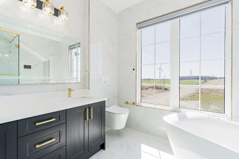 - Quartz-topped dualsinkvanity with gold faucetsand lower cabinetsforstorage