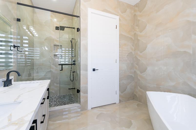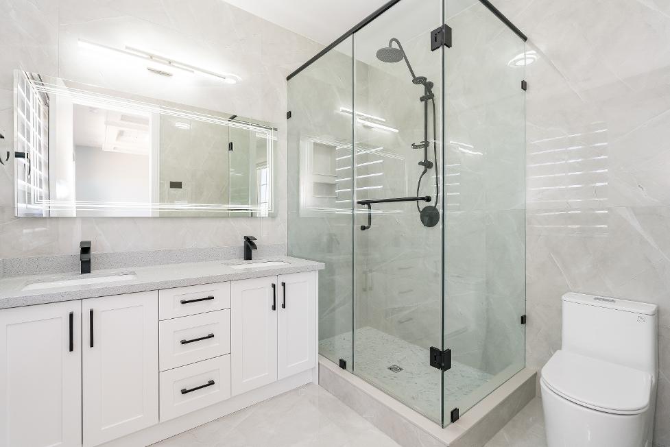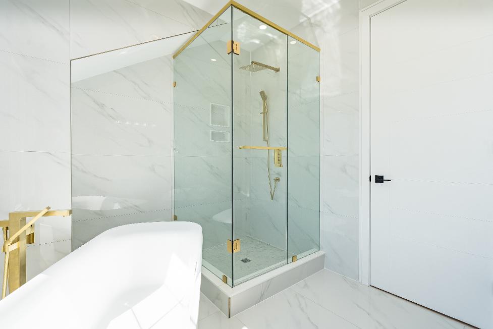 - Glass-walled showerwith a rainfallshowerhead,a handheld showerhead,and a built-in niche