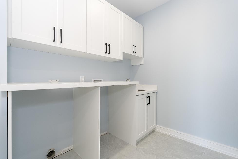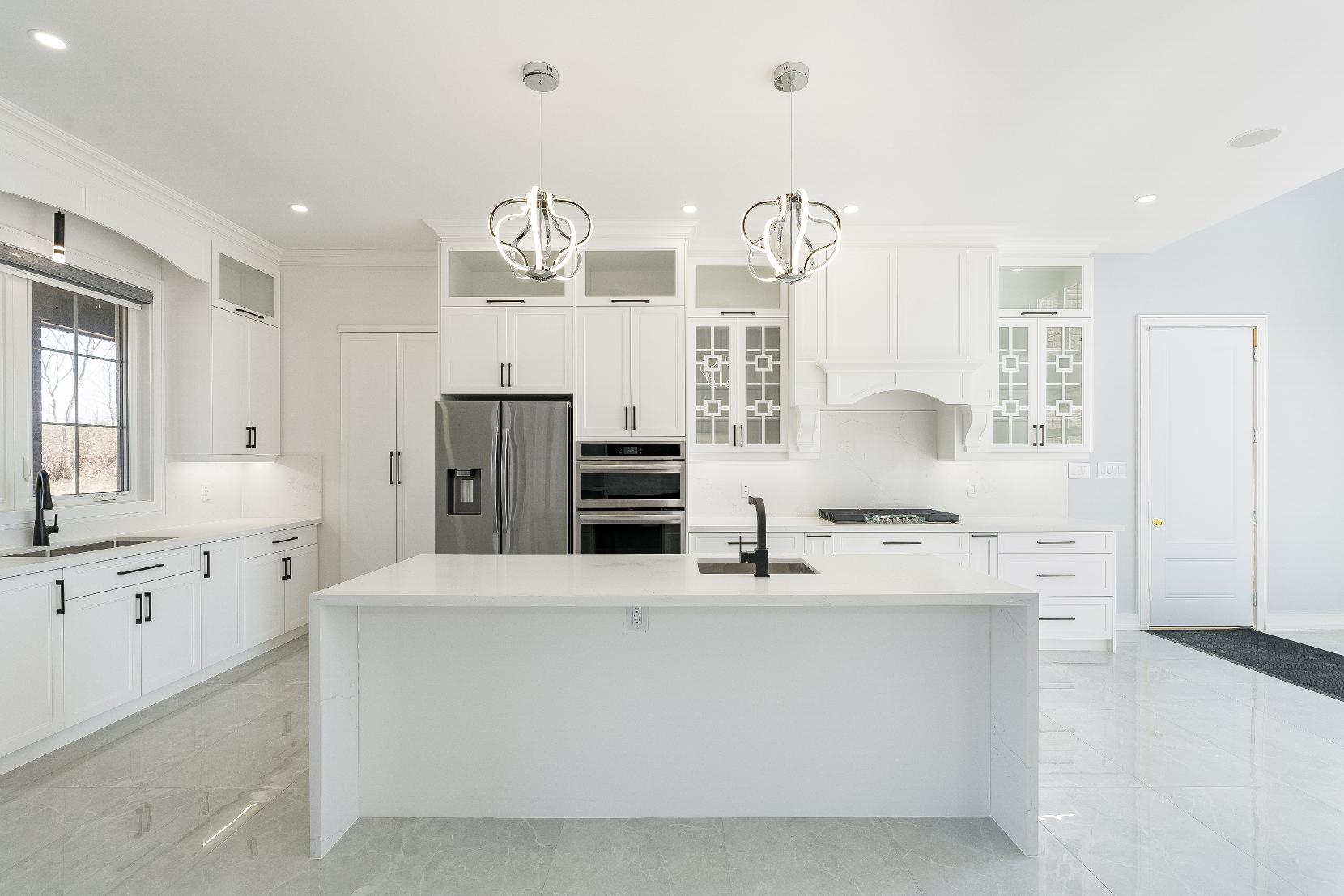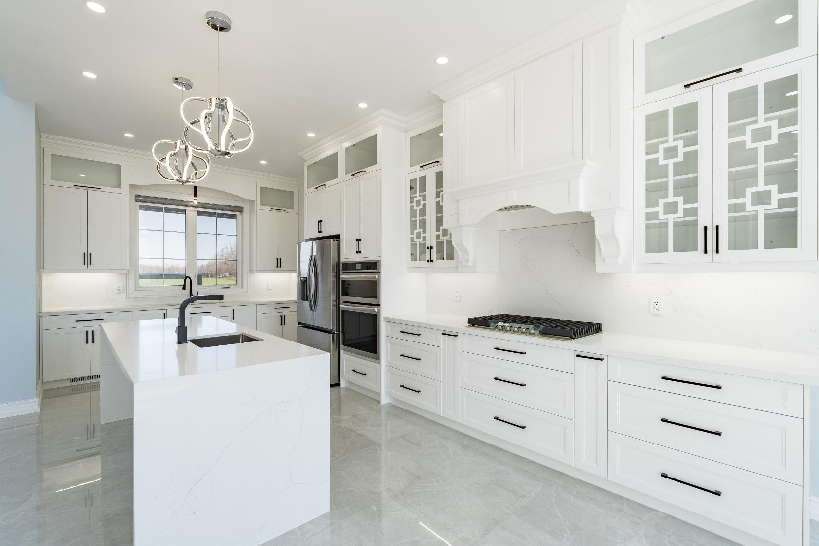 - Allwhitecabinetrywith contrasting black hardware and complementarycrown moulding detailing and undermount lighting