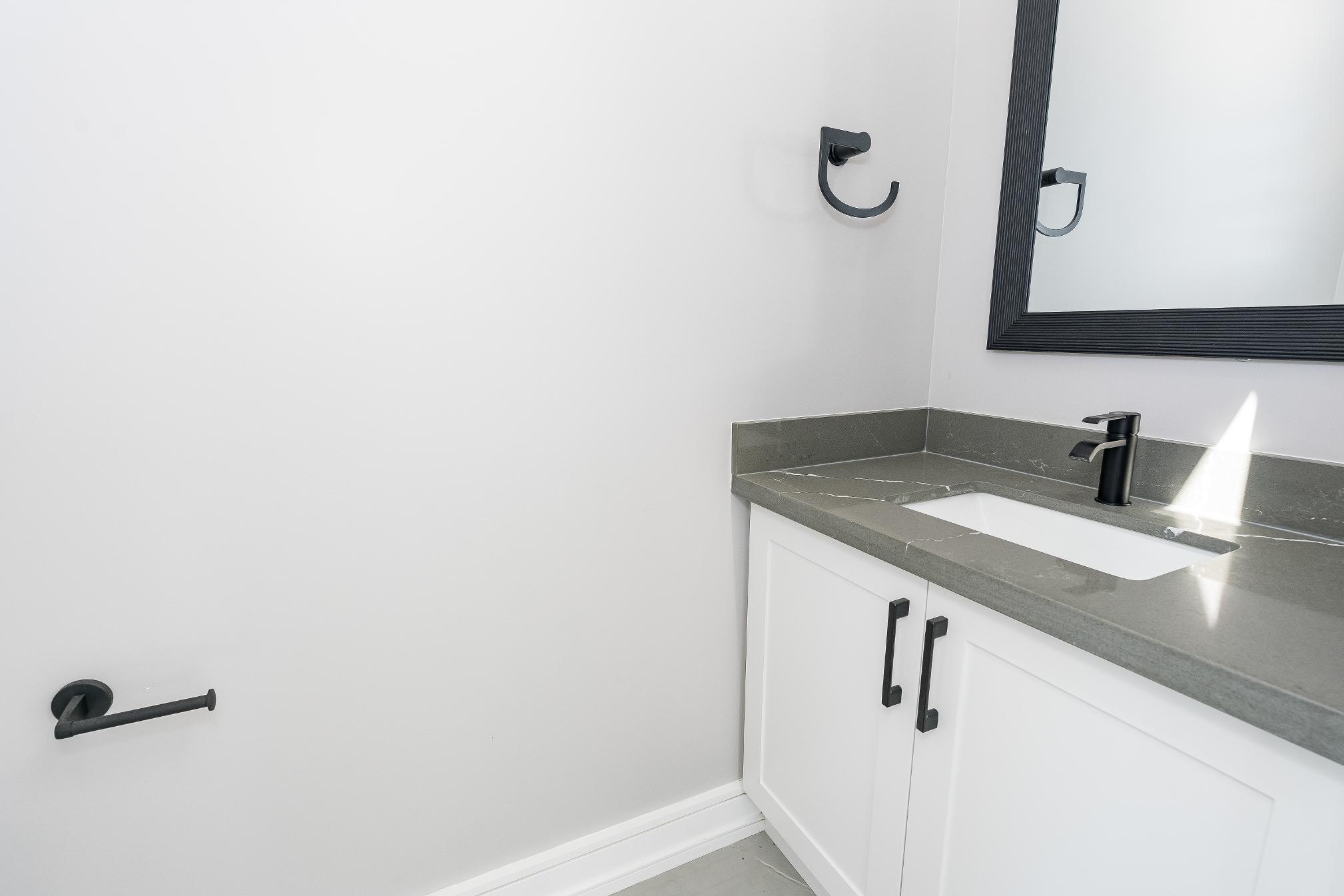- Quartz-topped dual sinkvanityadorned by blackhardware