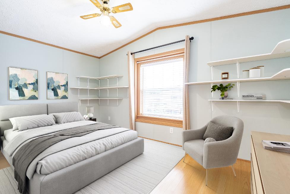 - Vaulted ceiling with a ceiling fan