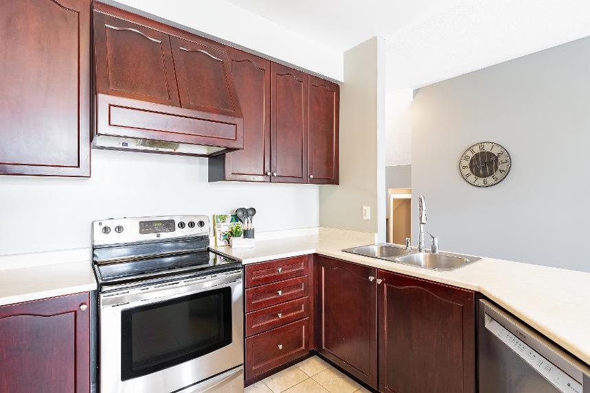 - Cherry-toned cabinetry