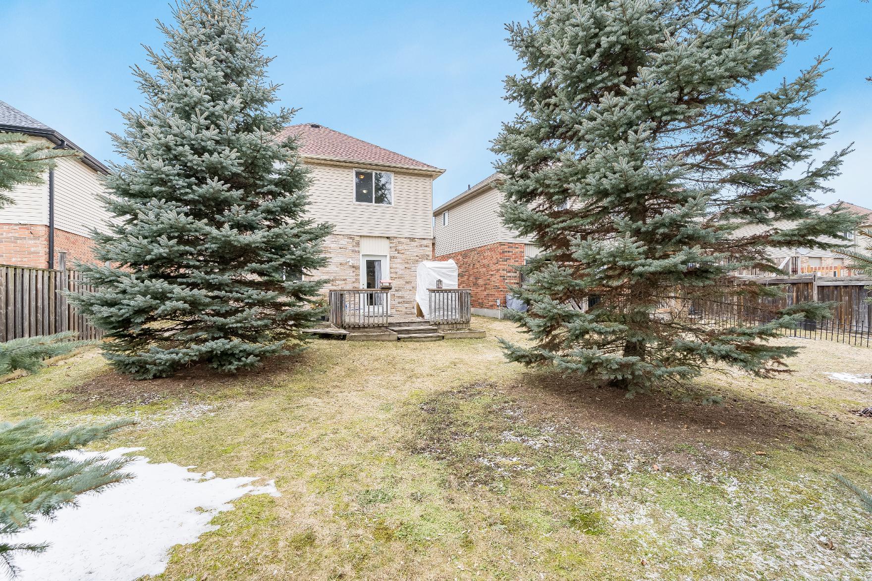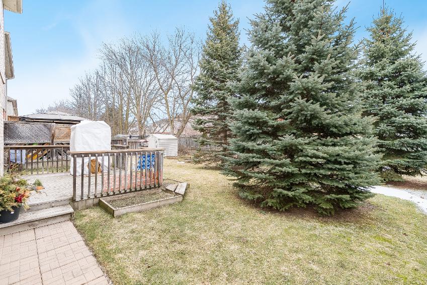 - Partiallyfenced backyard featuring a deckand maturetrees