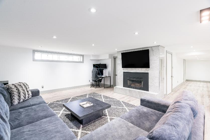 Step insideto discovera spacious,fullyfinished basement with a separateentrance,ideal formulti-generationalliving orentertaining,whilethe large gamesroom includesa cozy fireplace and a rough-in fora kitchen orbarwith plumbing,electrical,and a hood vent, offering endlesspossibilities