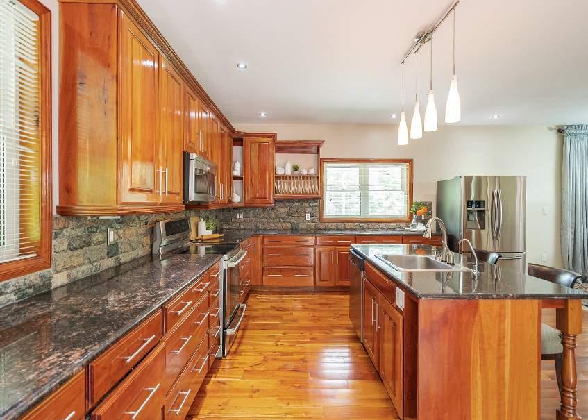 - Granite countertopscomplemented bya tiled backsplash