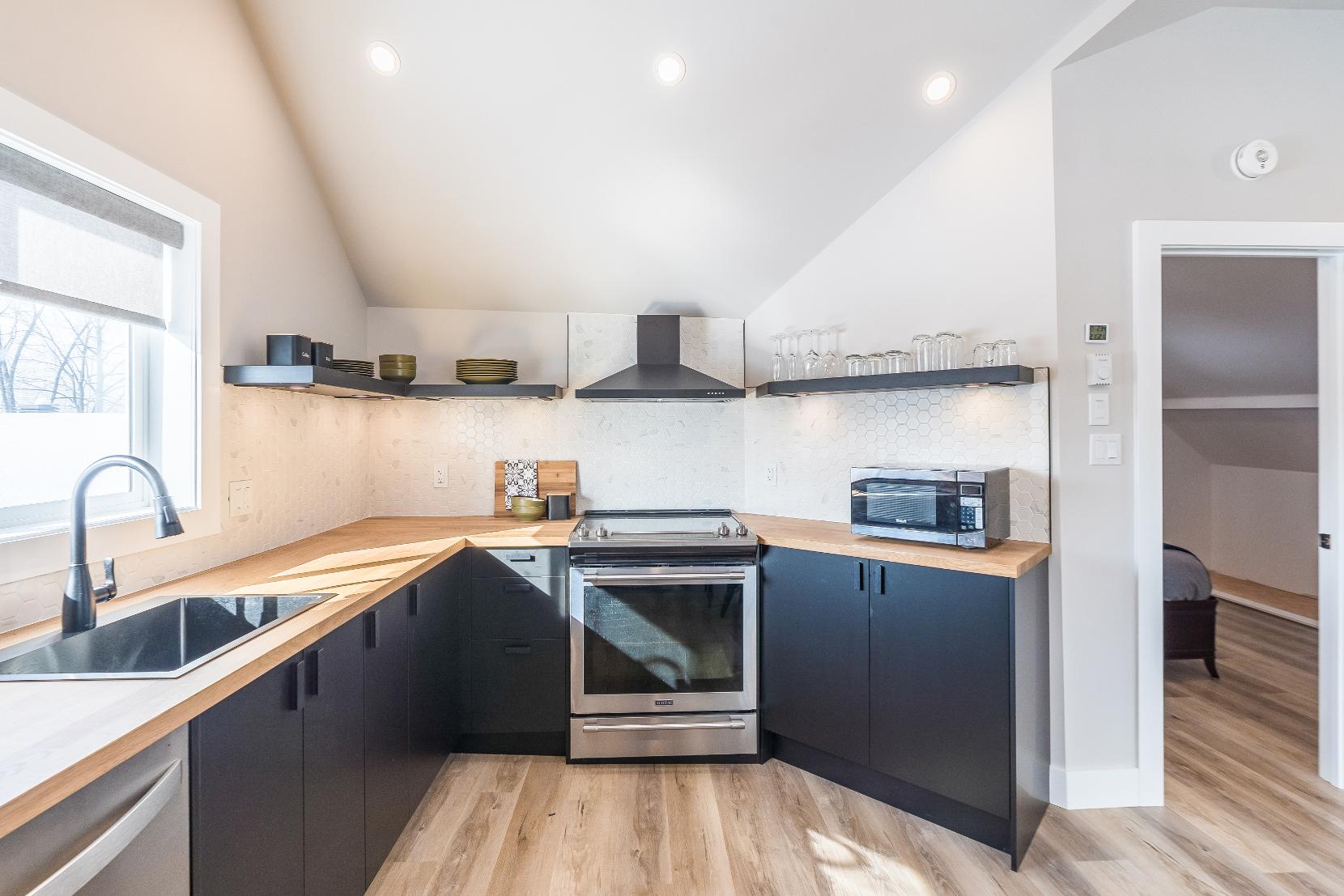 - Butcherblockcountertop accented by dark-toned cabinetryand a mosaic tiled backsplash