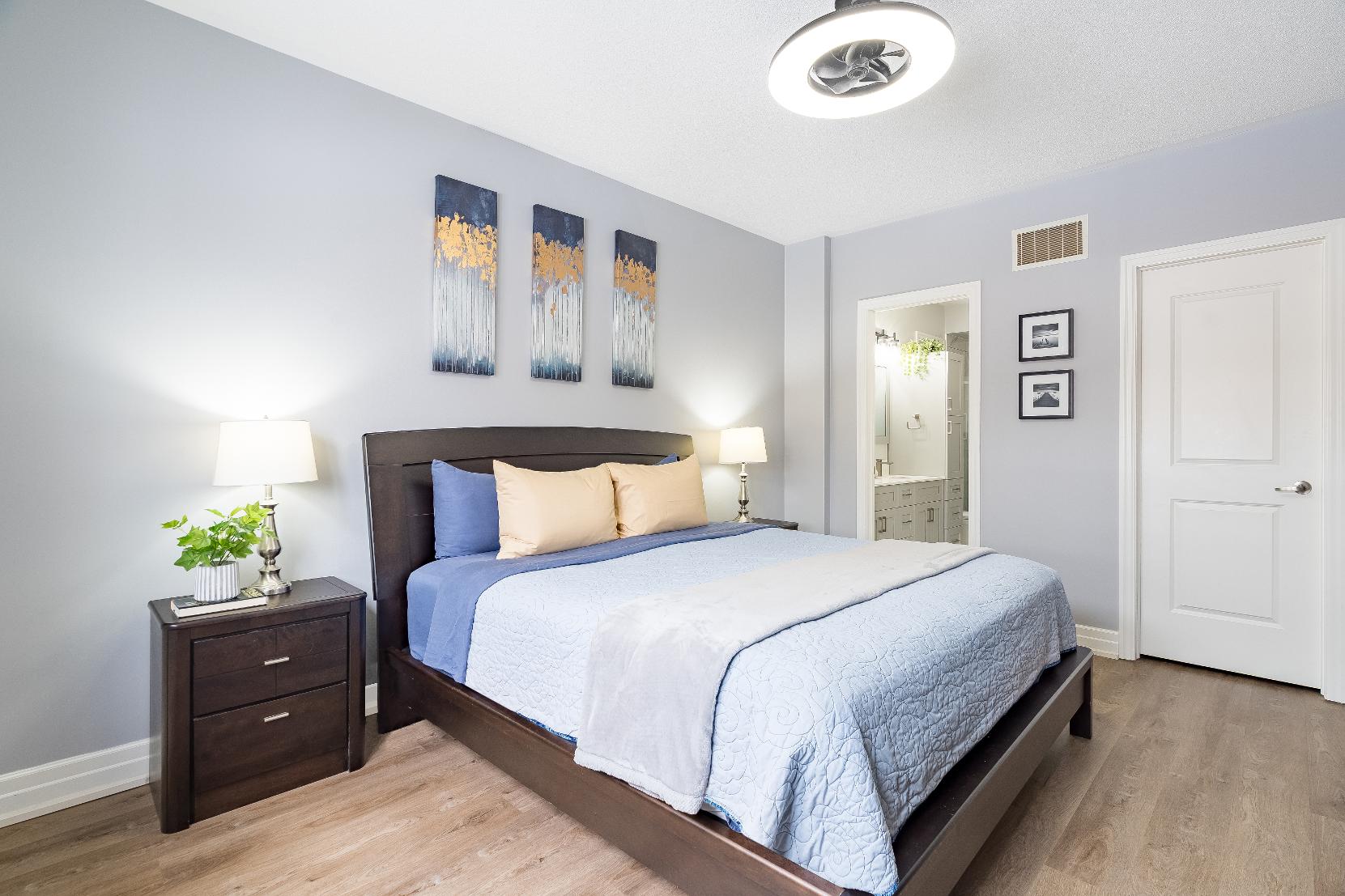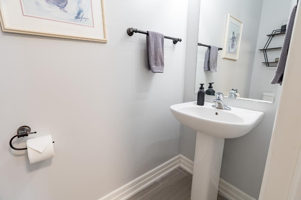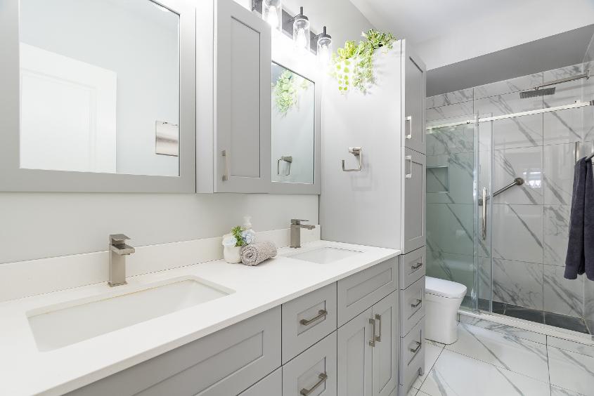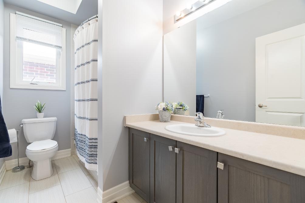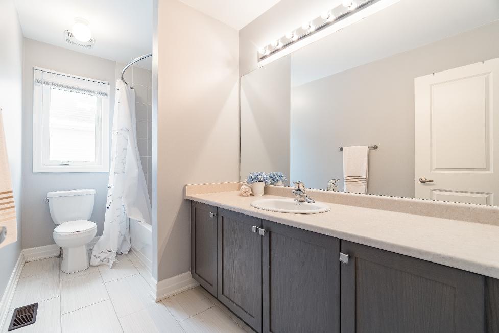 - Quartz-topped dualsinkvanitycomplete with ample cabinetry