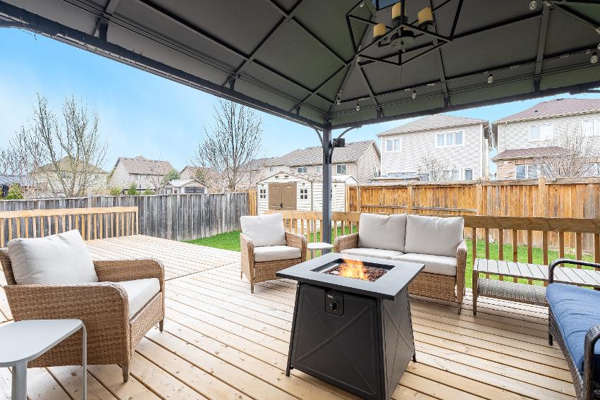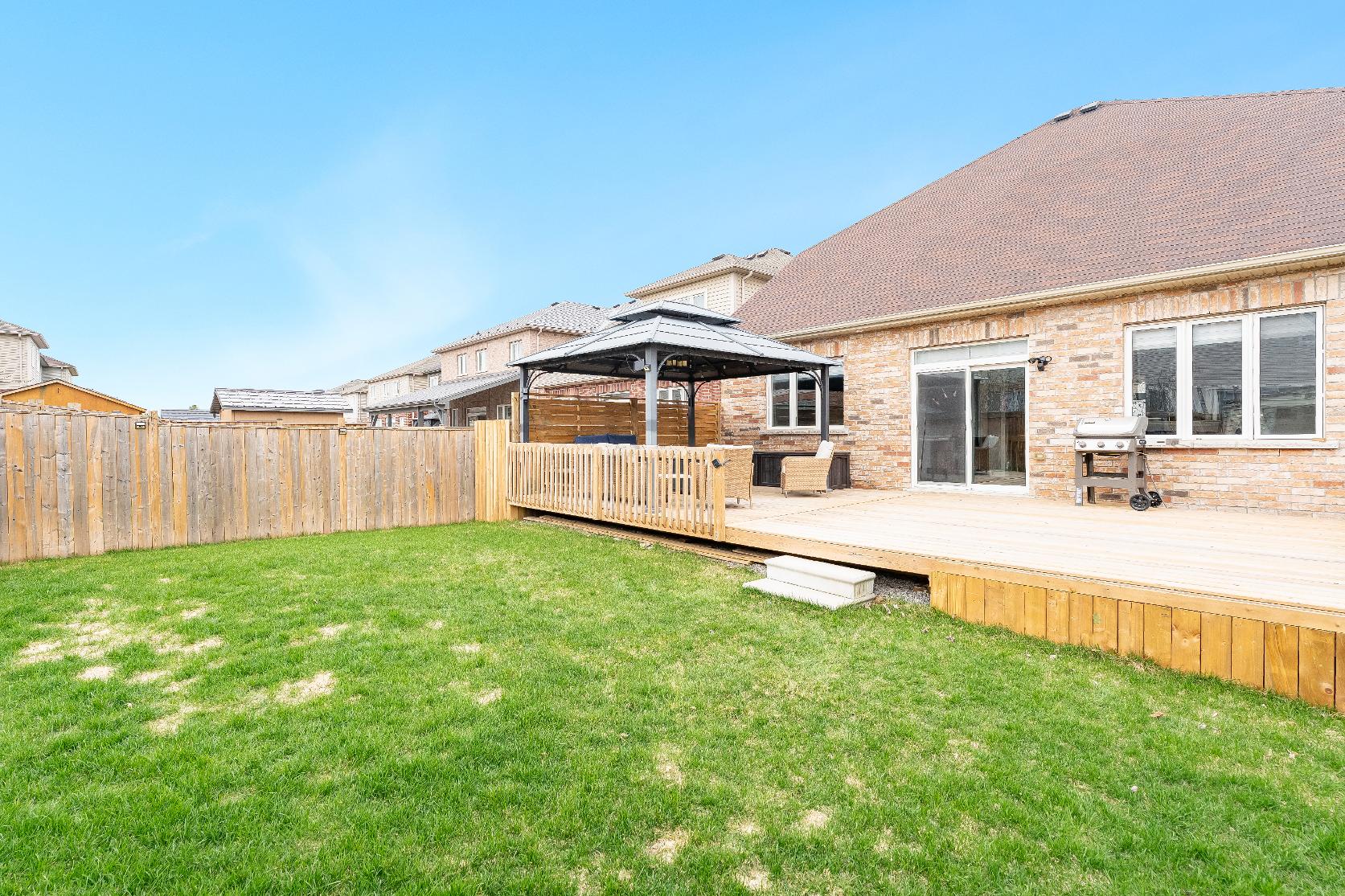 - Fullyfenced backyard re-imagined in 2024,complete with a large deck, a 10'x14' gazebo,a newergarden