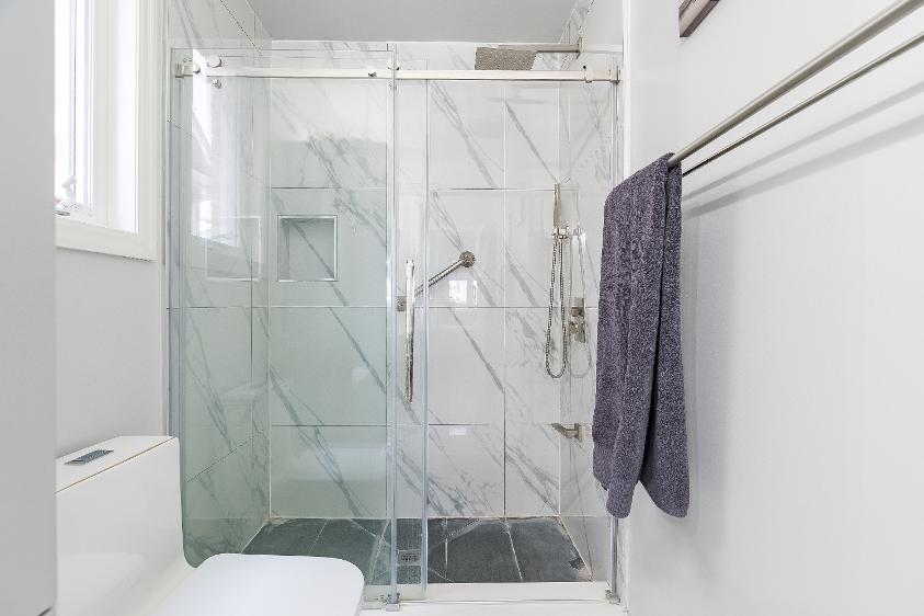 - Glass-enclosed walk-in showershowcasing a tilesurround,a rainfallshowerhead,a handheld showerhead,and a built-in niche