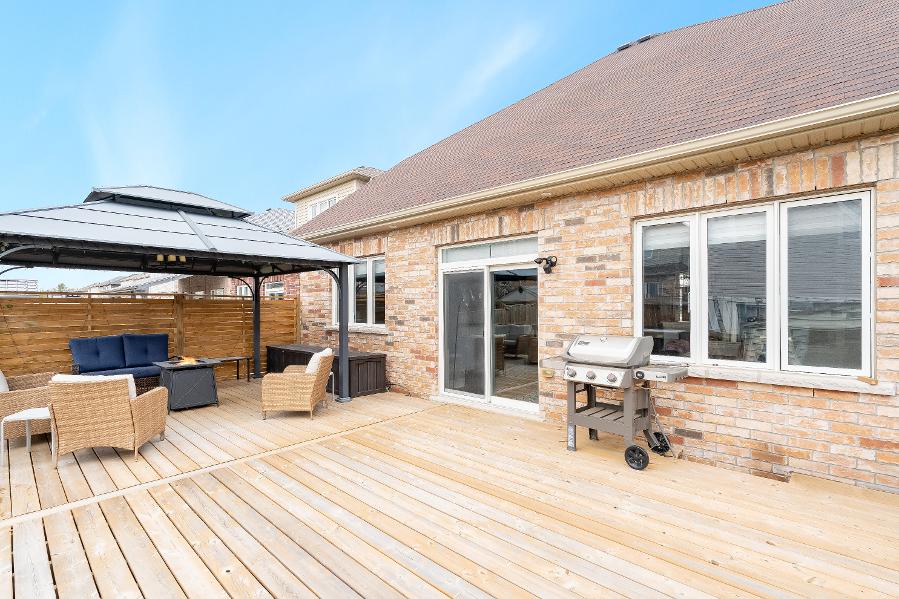 Step outsideto a beautifullylandscaped backyard featuring a spaciousdeck,a 12'x14' gazebo,a gas lineforbarbecuing,and ambient backyard lighting,perfect forrelaxing orhosting summergatherings, along with a Wi-Fi-controlled in-ground sprinklersystem enhancing both the front and backyard
