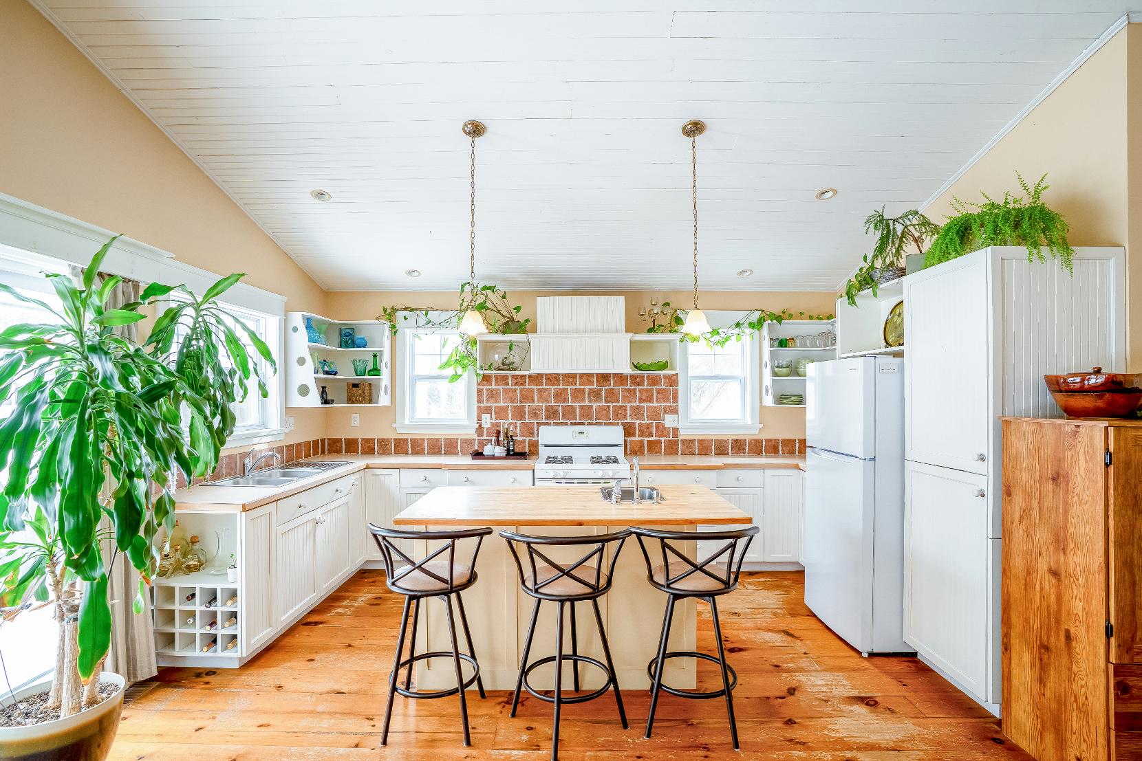 The main living area boastsvaulted ceilings,a cozywood-burning fireplace,and an open-concept kitchen completewith an island and breakfast bar