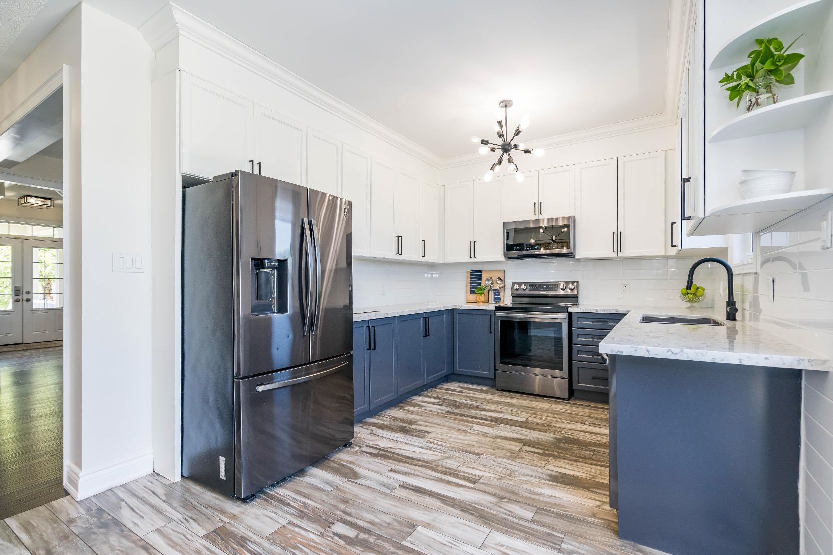 - Wealth of dual-toned cabinetrycontrasted byblackhardwareand crown moulding detailing
