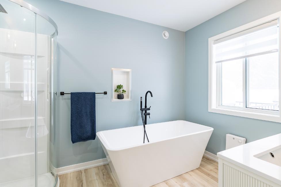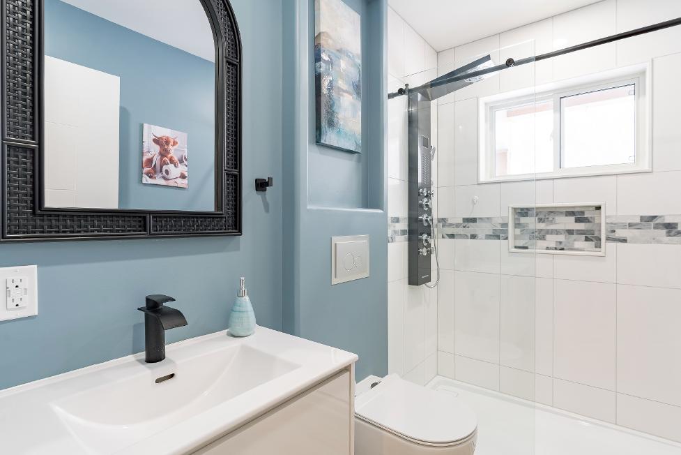 - Walk-in tiled showerwith a jetted rainfallshowersystem and a built-in niche