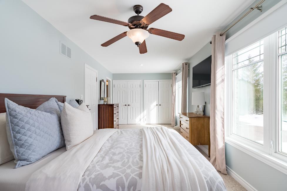 - Vaulted ceiling with an exposed beam and ceiling fan foradded aircirculation
