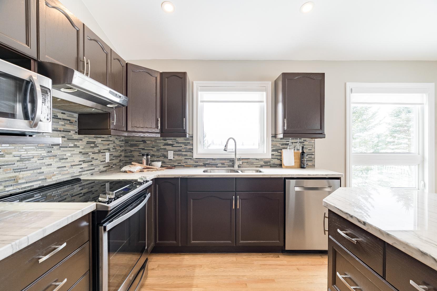 - Deep-toned cabinetrycomplemented by granite countertopsand a tiled backsplash