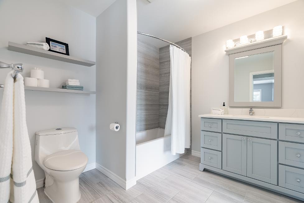 - Sleekvanityequipped with multipledrawersforstoring toiletries