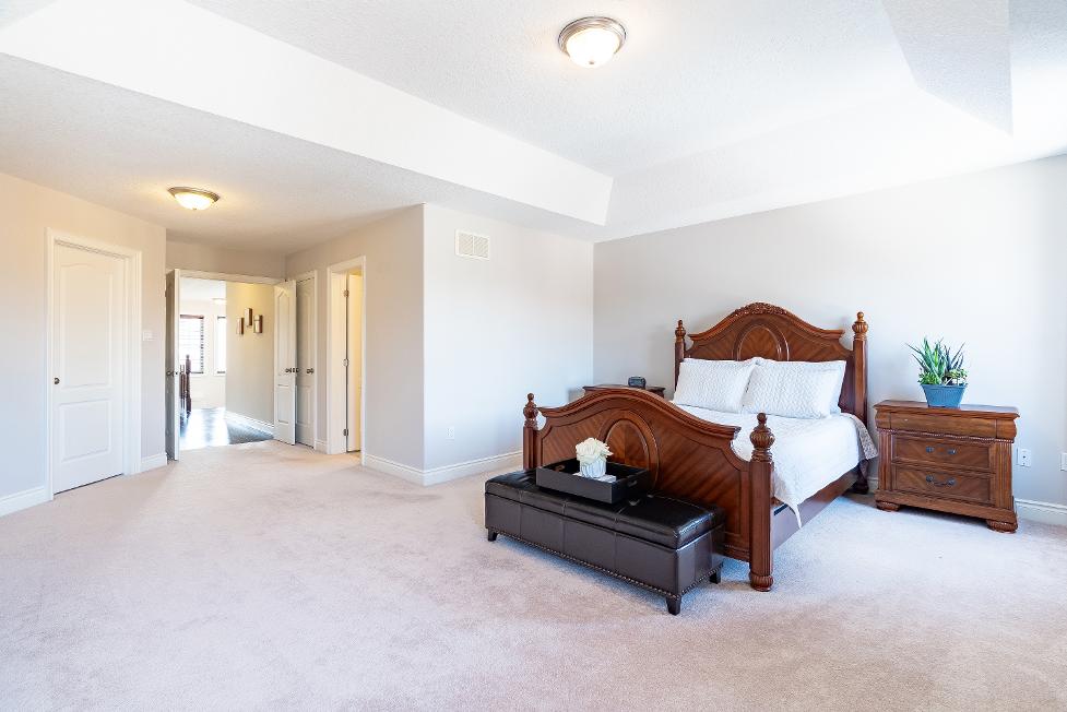 Upstairs,the spaciousprimarysuitefeaturesan elegant trayceiling,a walk-in closet,and a luxurious5-pieceensuite with a soakertub and a separateglassshower,accompanied bythree additionalgenerouslysized bedroomsand a well-appointed 5-piecemain bathroom with a dual-sinkvanityand separatebathtub and shower