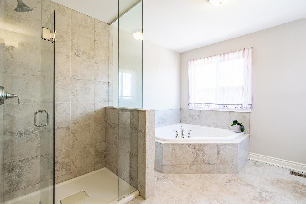 - Glassenclosed walk-in shower complemented bya tiled surround