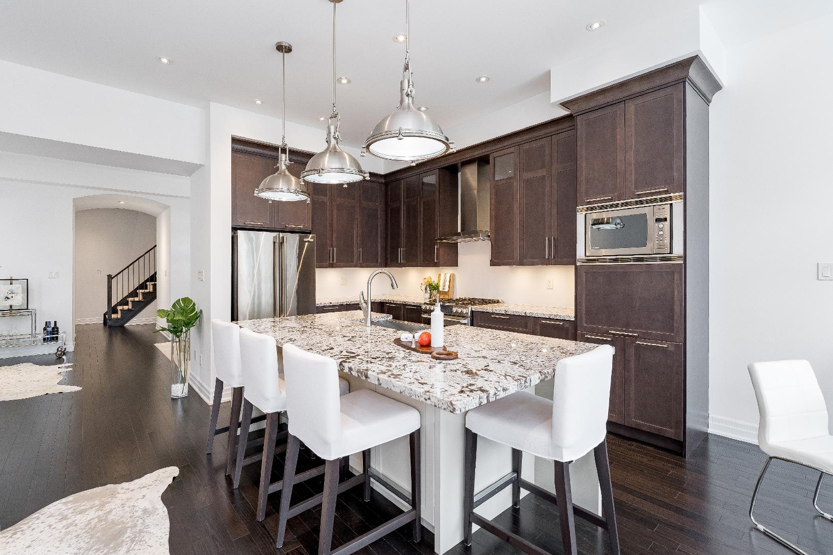 - Largeisland with breakfast barseating enhanced byoverhead pendant lighting
