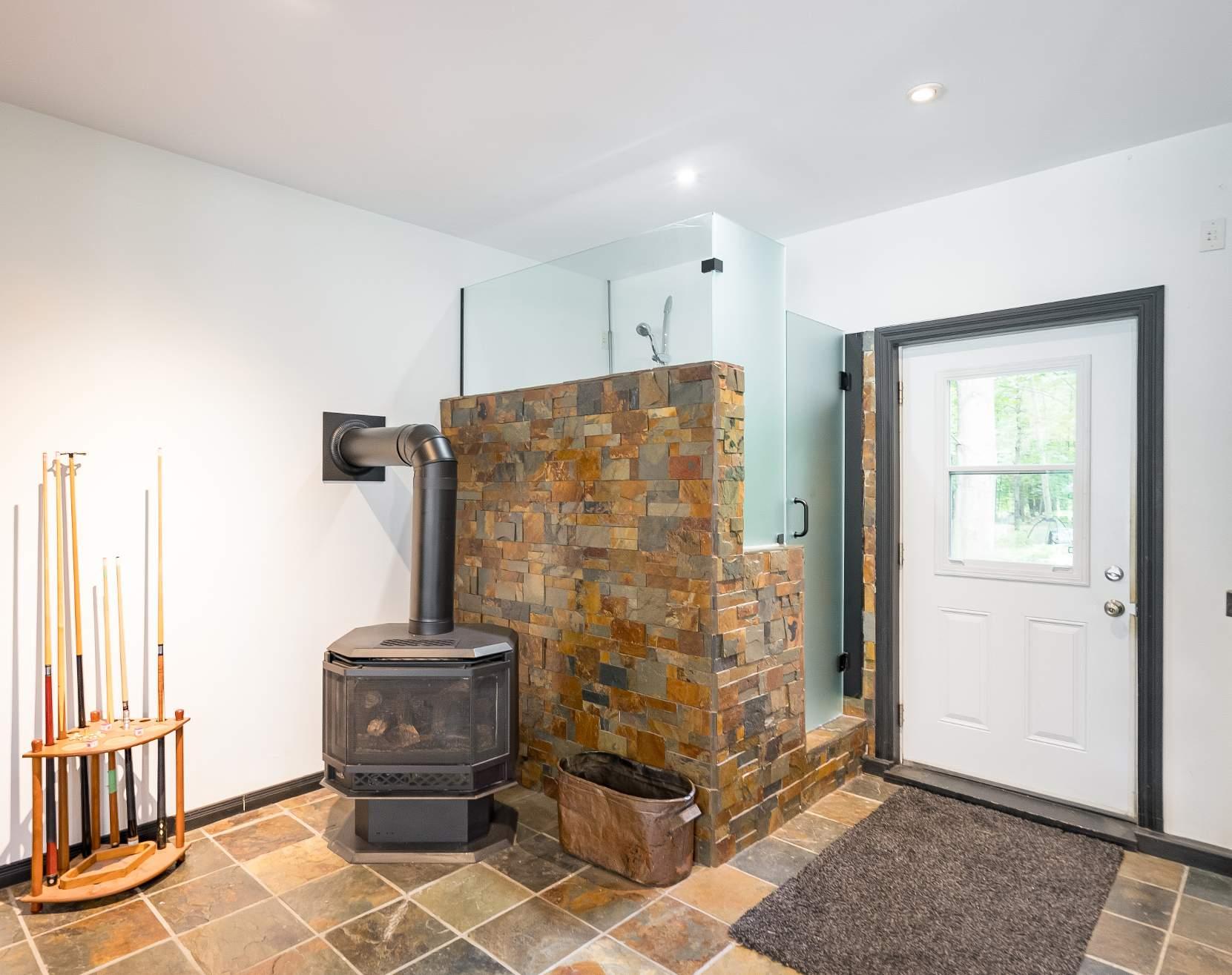 - Glassenclosed walk-inshowerset within a slatetile surround