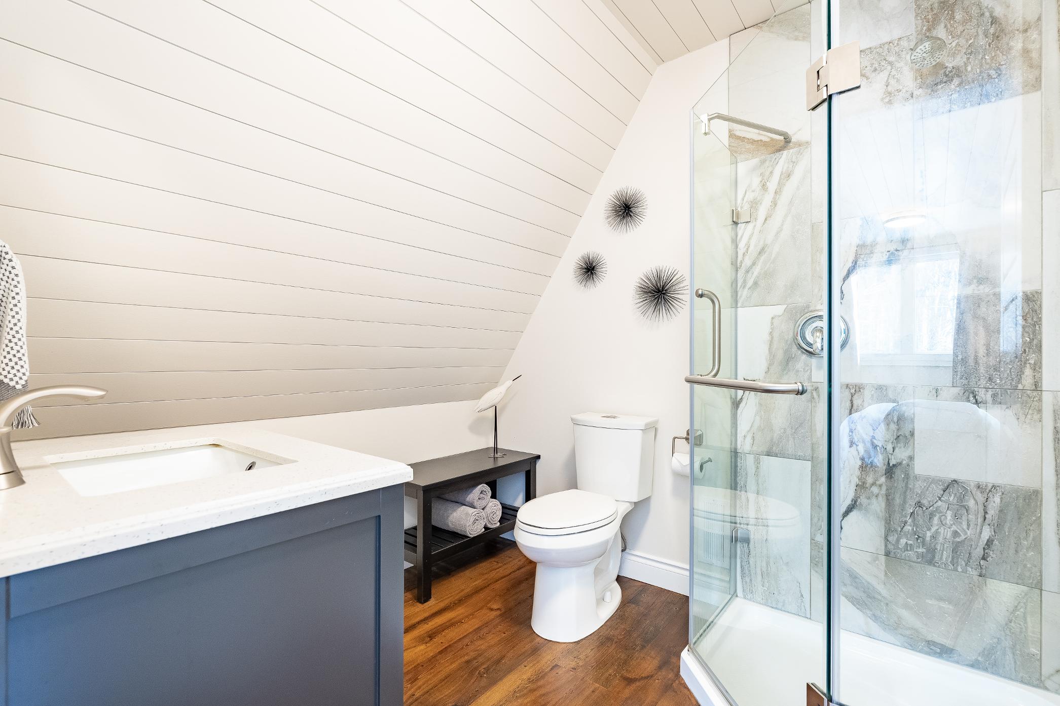 - Vanitywith an under-mount sinkand cabinet spaceforbath essentials