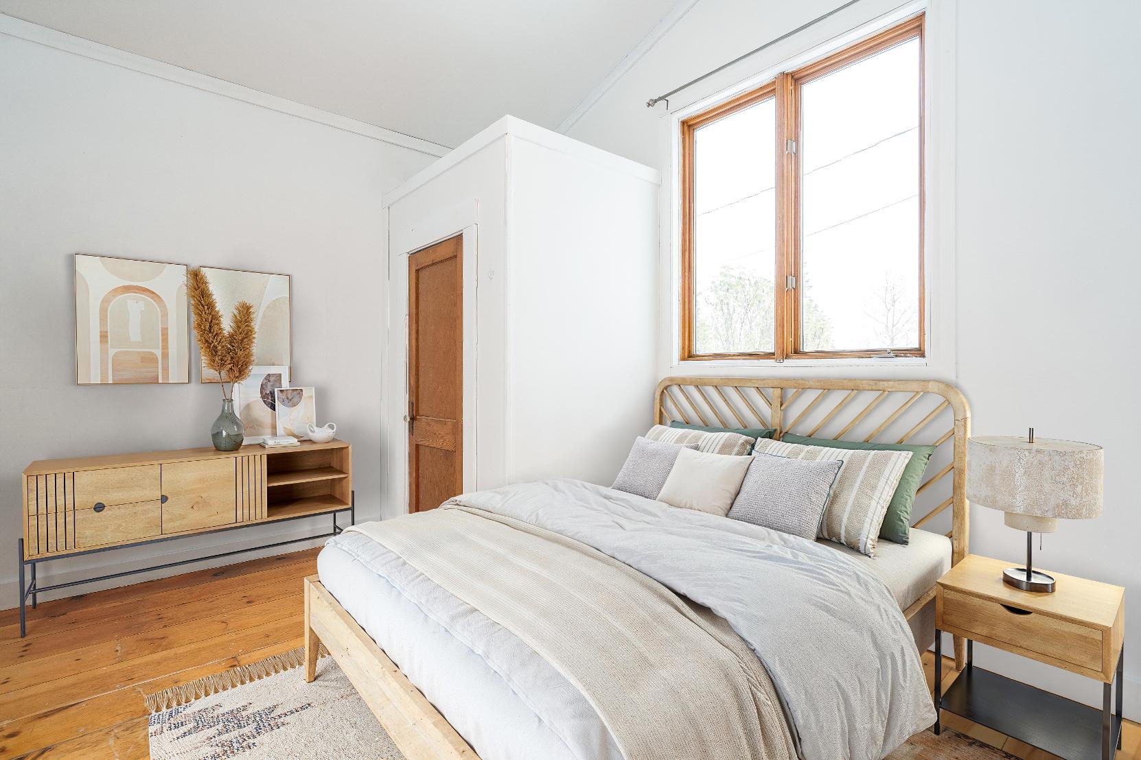 - Neutralpaint hue contrasted bya wood featurewall