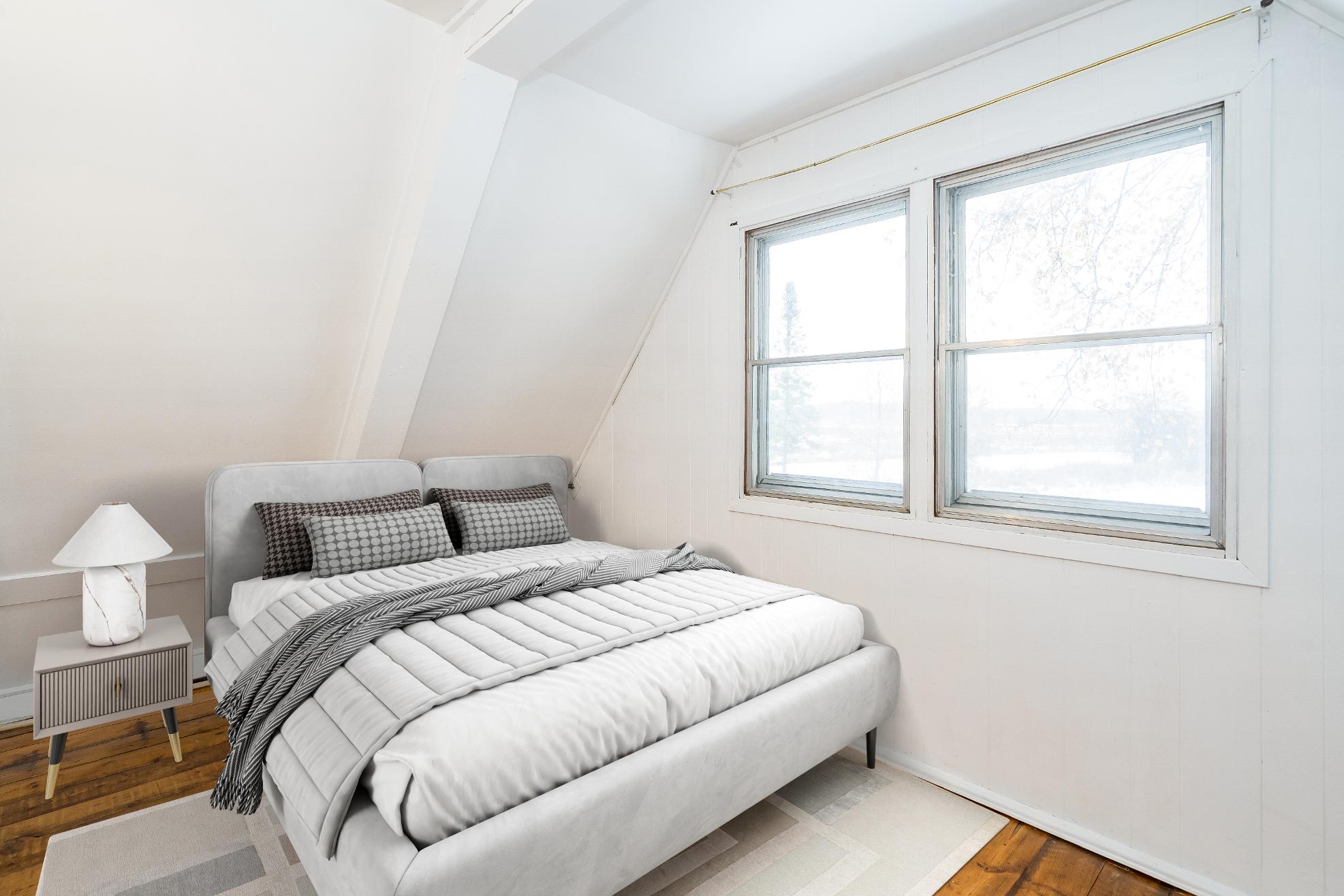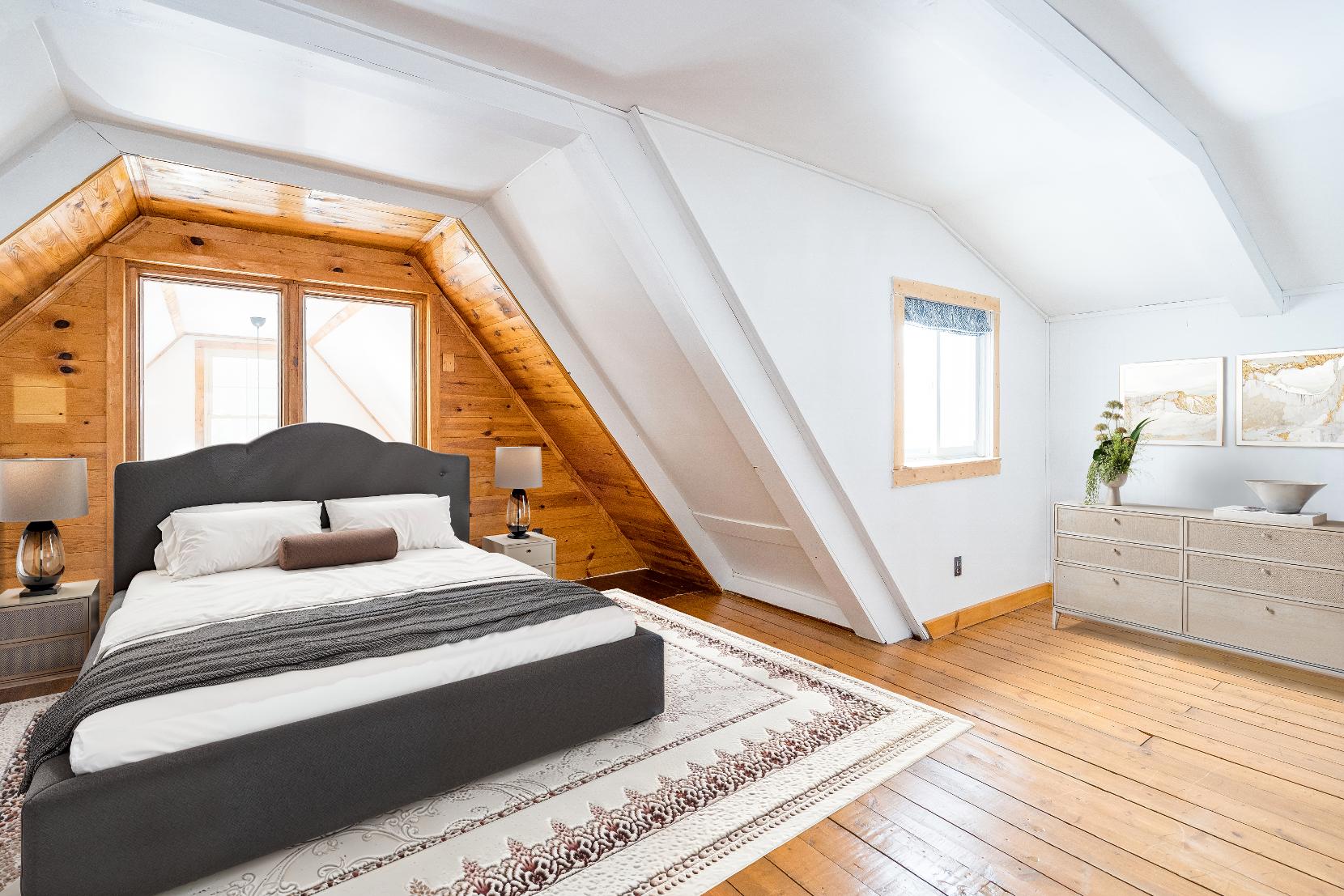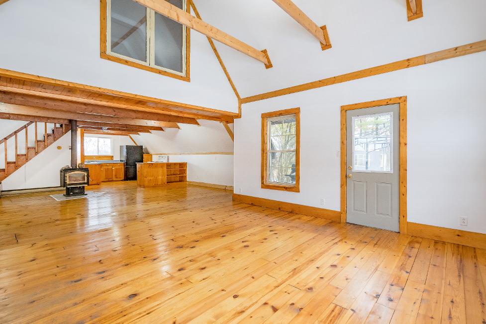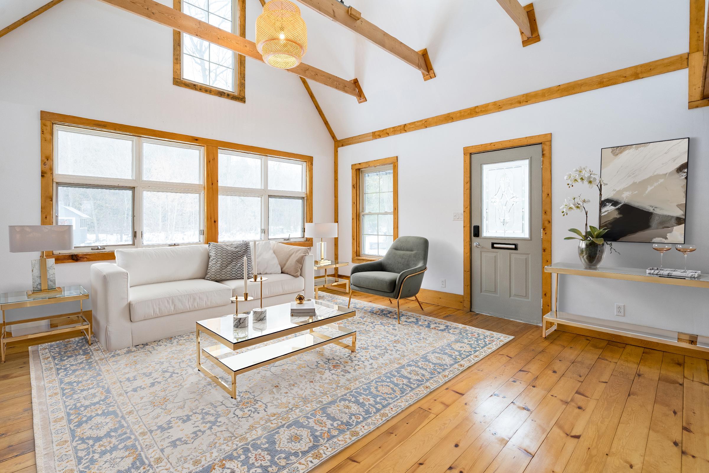 The main three bedroom,one bathroom cottageexudesrustic charm with exposed wood beams,vaulted ceilings,and sun-filled windowsthat bring the outdoorsin, mixing cozycomfort and naturalwarmth foryear-round living orweekend getaways