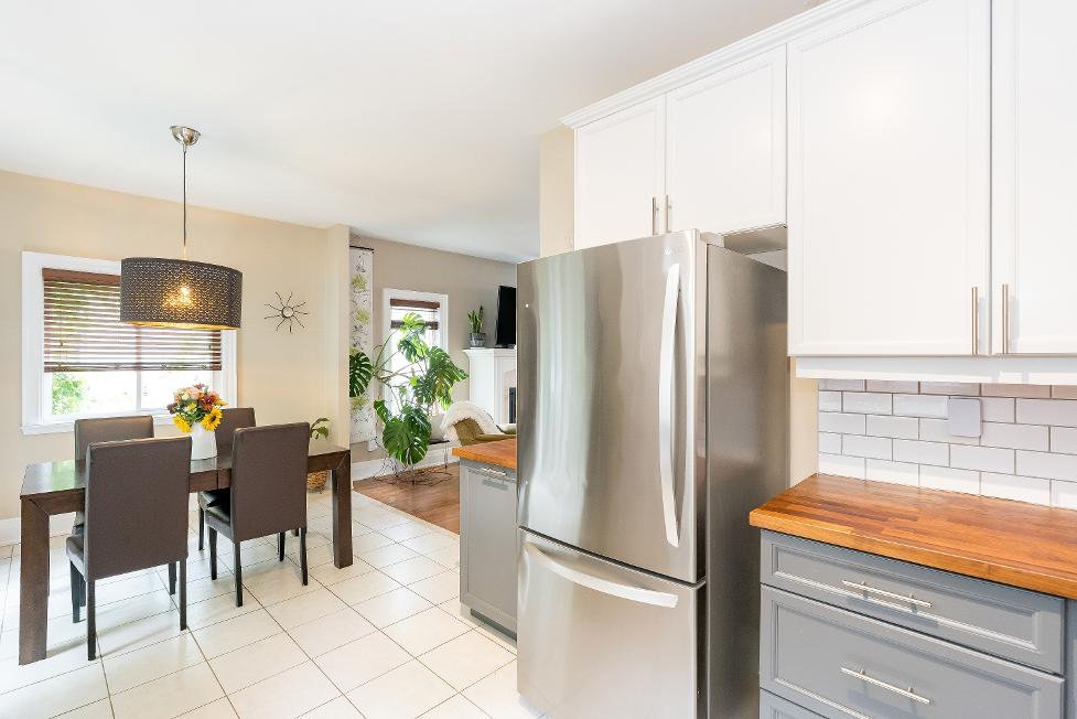 Atrue chef?sdelight with stainless-steelappliances,a butcherblockcountertop,a classic subwaytiled backsplash,and tall cabinetrywith crown moulding detailing,meanwhilethe adjoining dining room featureswalkout accessto the deck,enhancing indoorand outdoorliving with ease