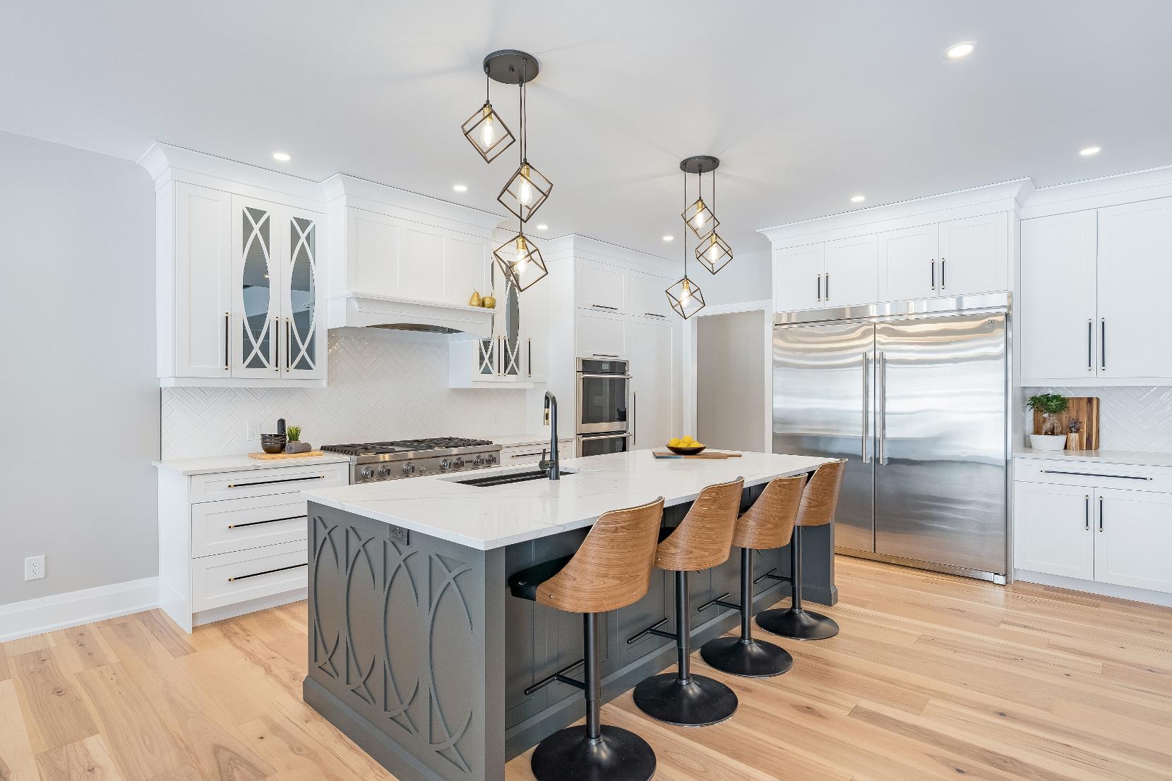 - Quartzcountertopscomplemented bya herringbonetile backsplash