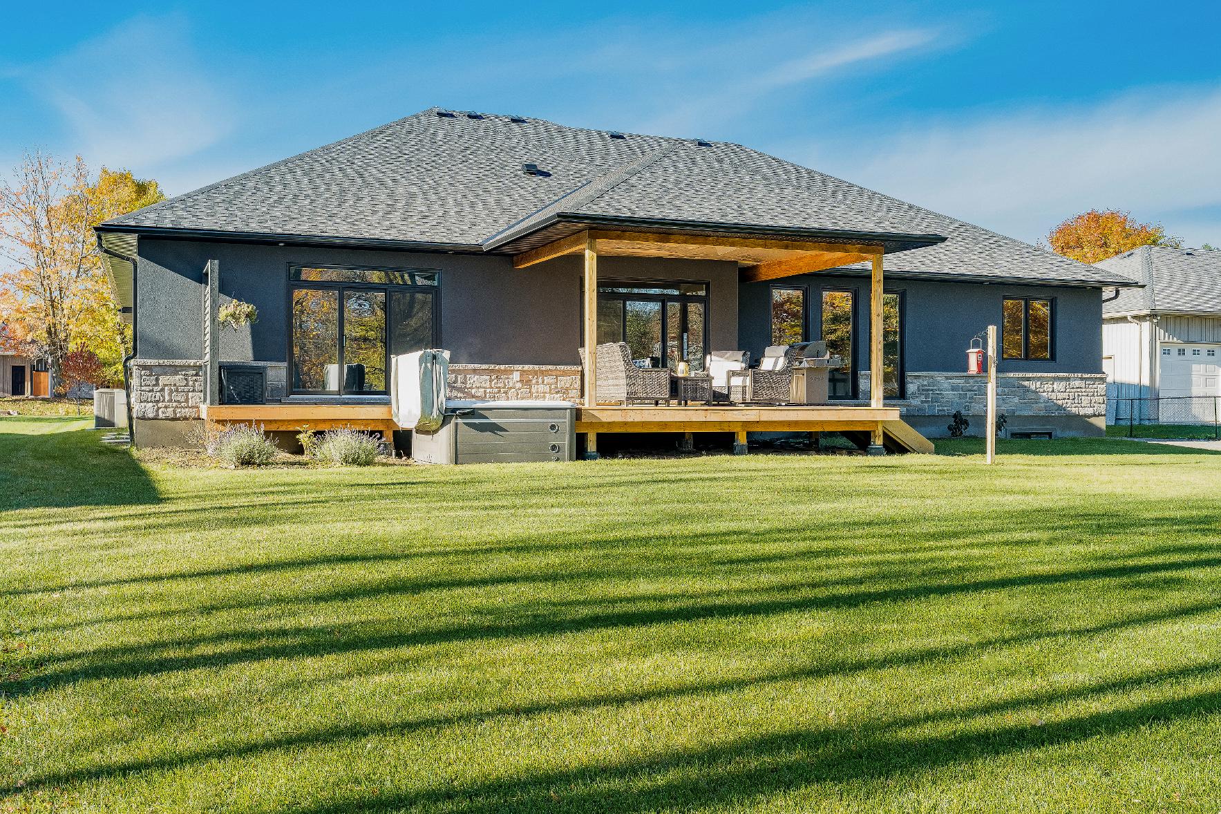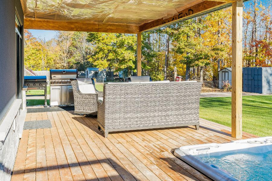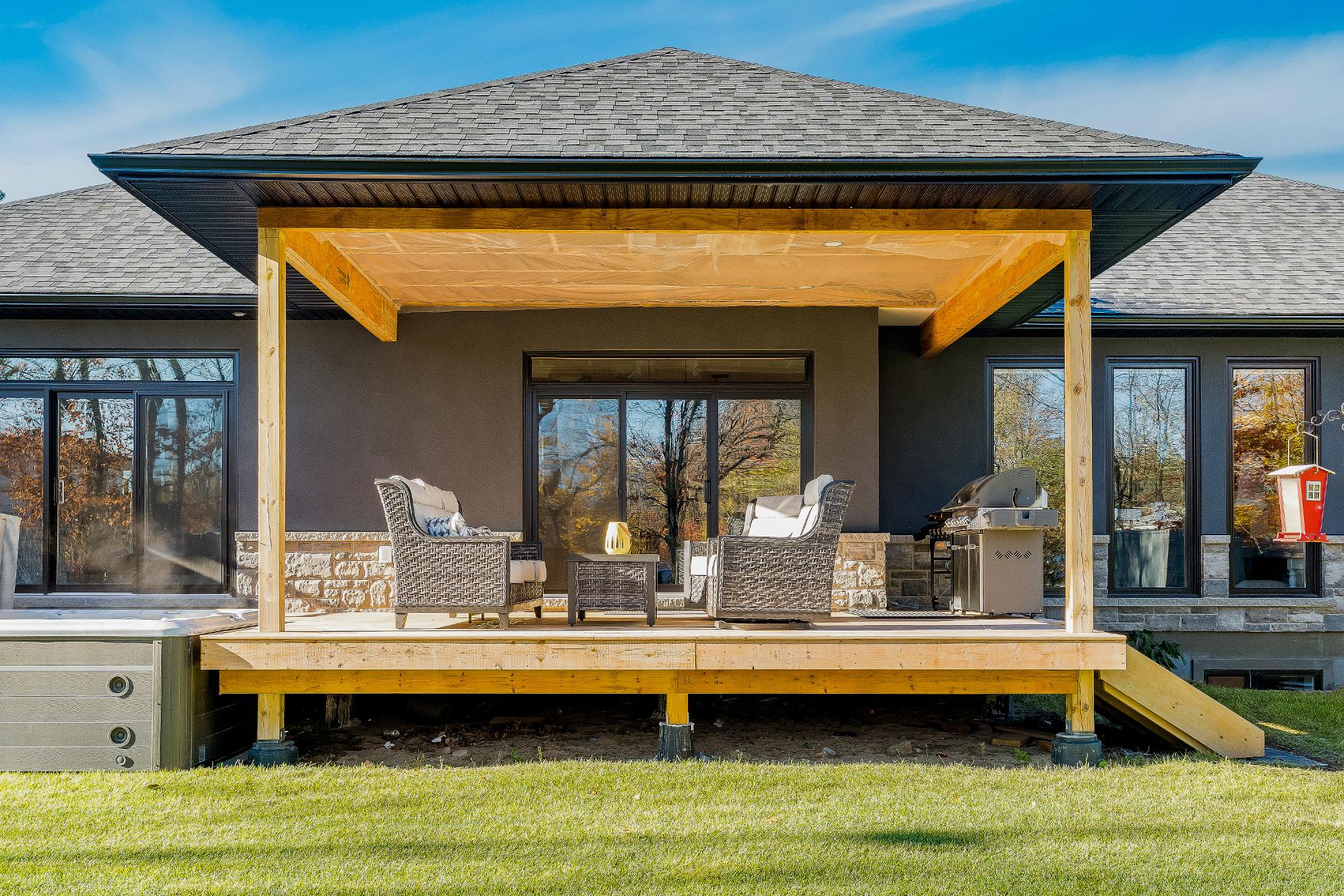 - Incrediblebackyard retreat finished with a largecovered deck,a relaxing hot tub foryear-round enjoyment, and plentyof greenspace enveloped bymaturetrees