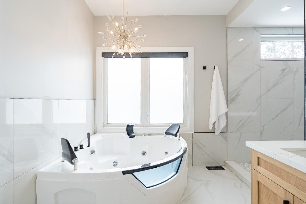 Retreat to the luxuriousprimarysuitedesigned to impress,complete with a spaciouswalk-in closet and a stunning ensuite featuring a dualsinkvanity,an expansive walk-in shower,a cornersoakerjetted tub idealforunwinding,and a private water closet foradded separation,allfinished with direct accessto yourown privatedeck fora breath of fresh air