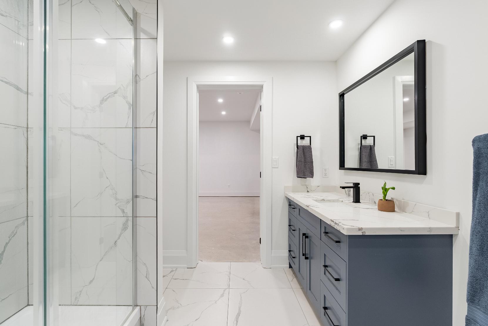 - Quartz-topped vanity finished with crisp whitecabinetry