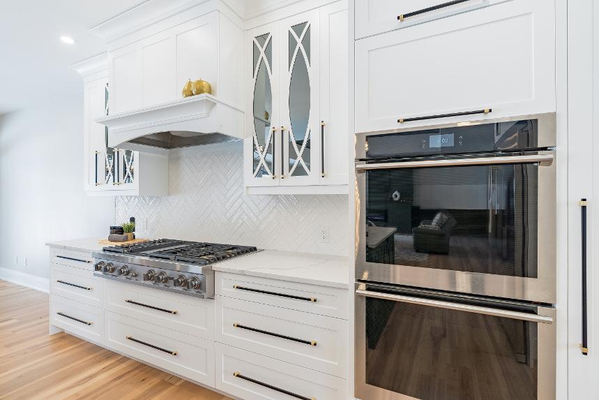 - Crisp whitecabinetryaccented bya crown moulding detail