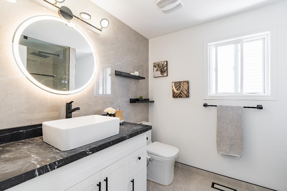 Impressive finished walkout basement featuring a sprawling recreation room,a custom 3-piecebathroom,radiant recessed lighting,and a direct walkout to a private backyard sitting area,perfect forentertaining familyand friends