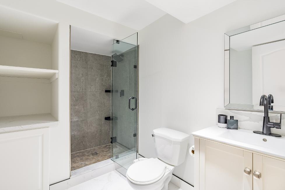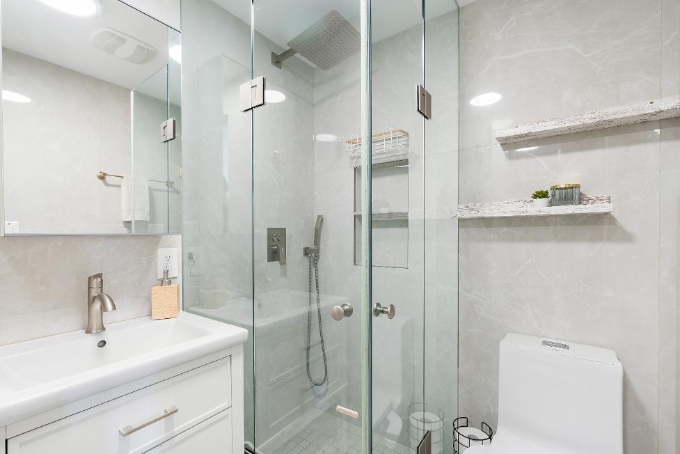 - Walk-in showerwith a niche,rainfallshower head,and a glassenclosure