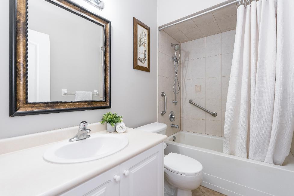 - Dualsinkvanitywith plentyof storagebelow fortoiletries