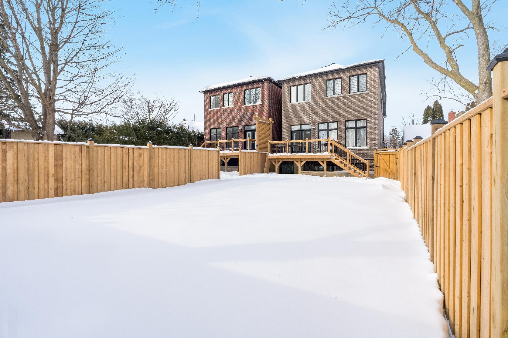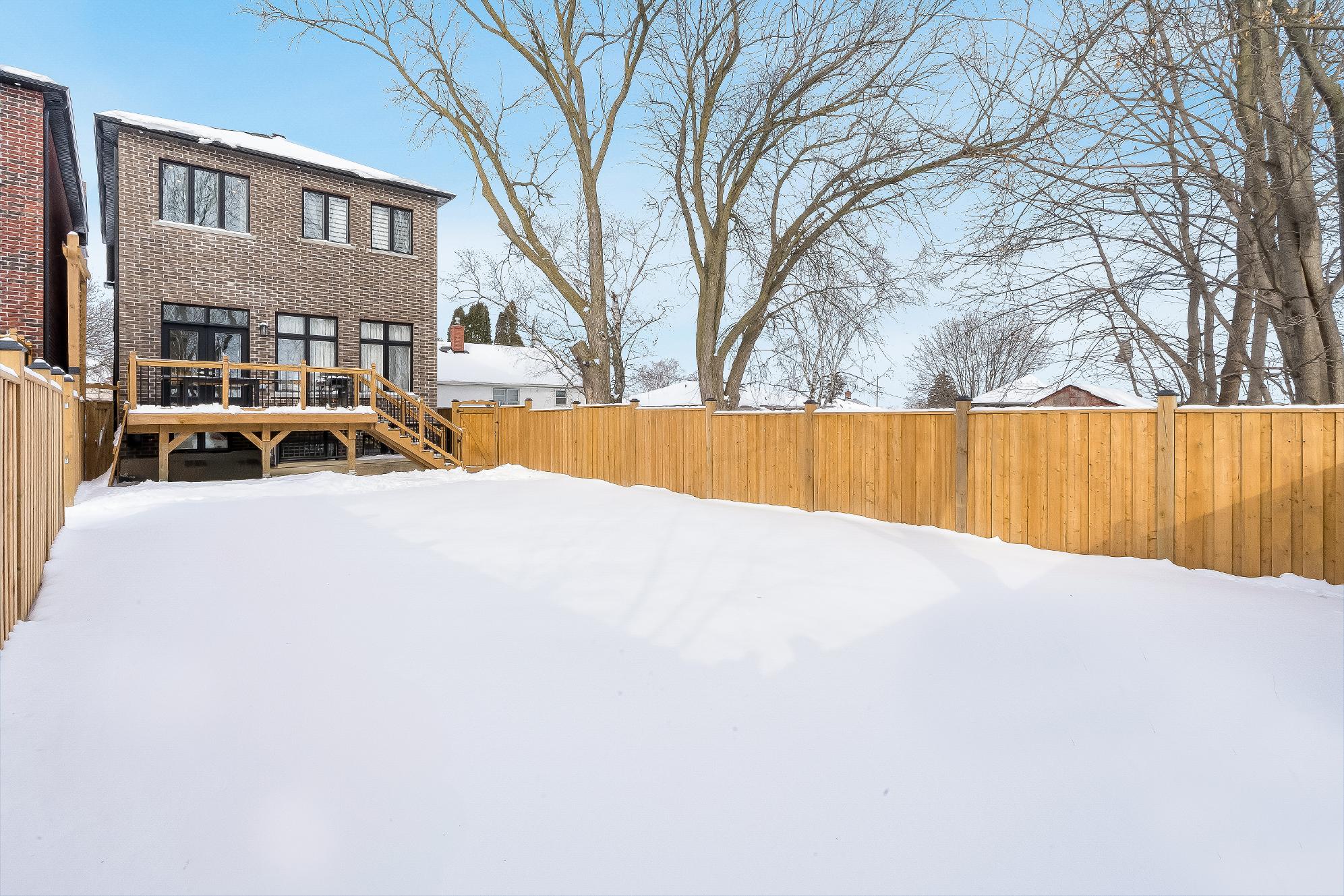 - Fullyfenced backyard equipped with a deckand greenspace