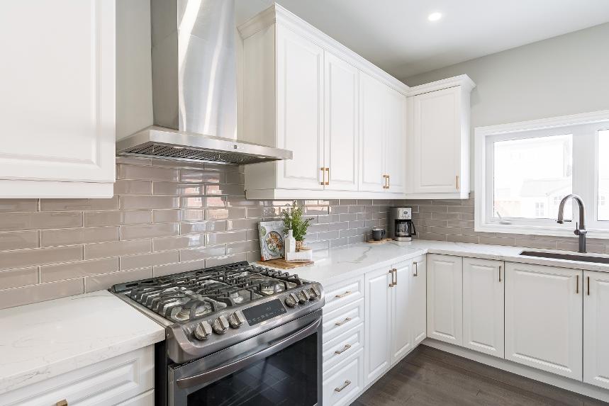 - Quartzcountertop complemented bya subwaytile backsplash