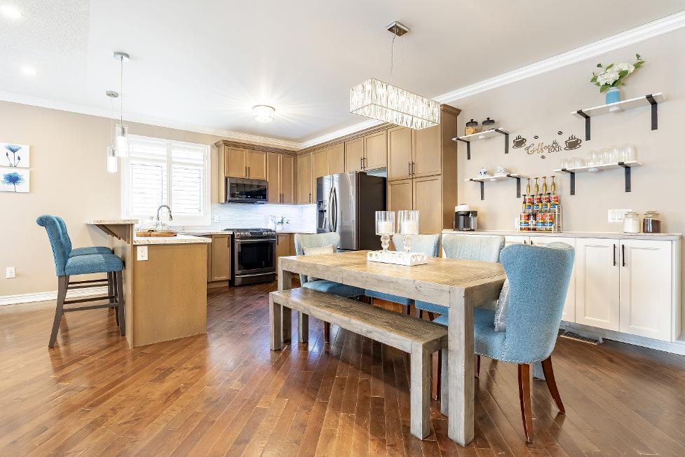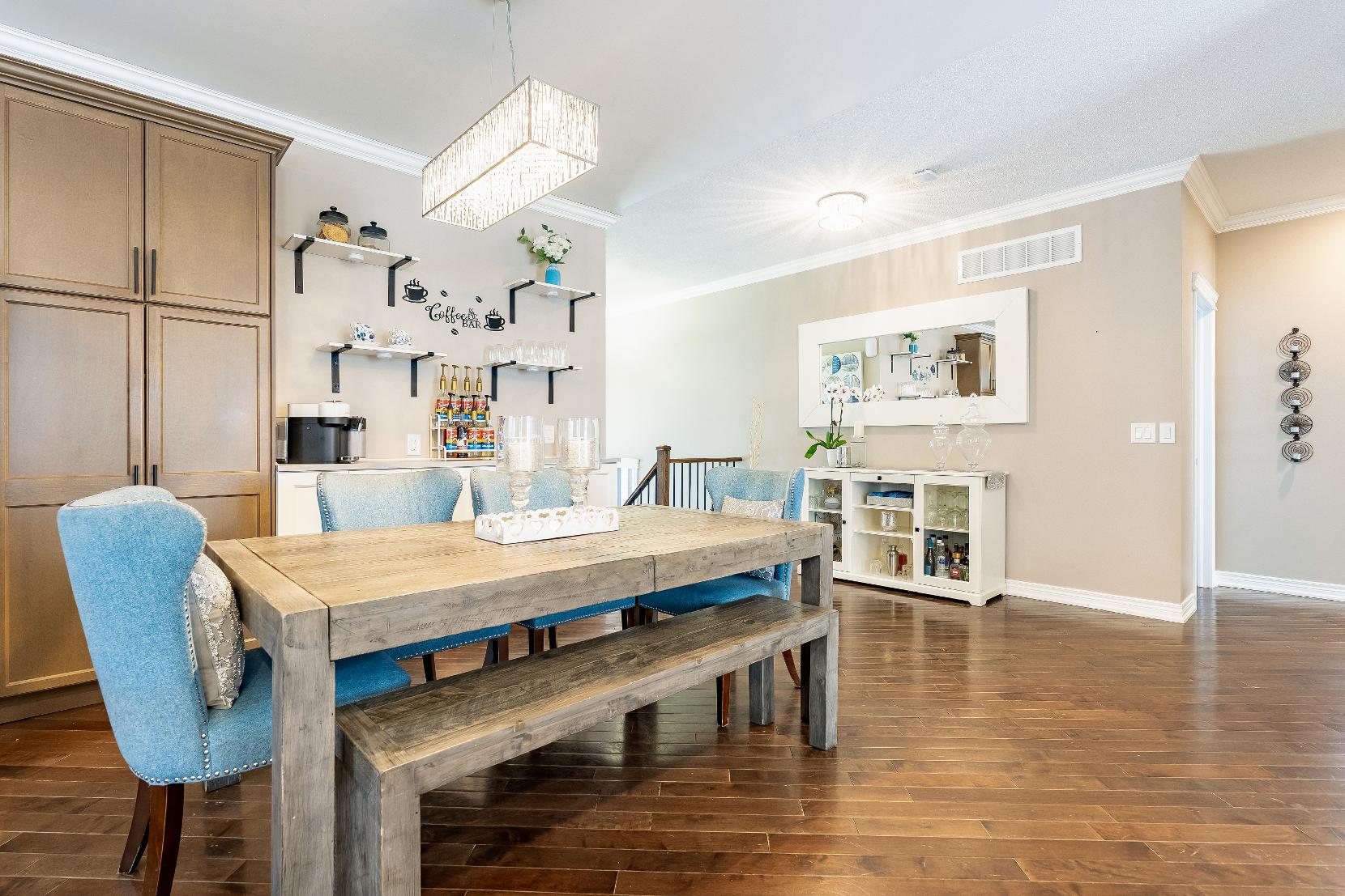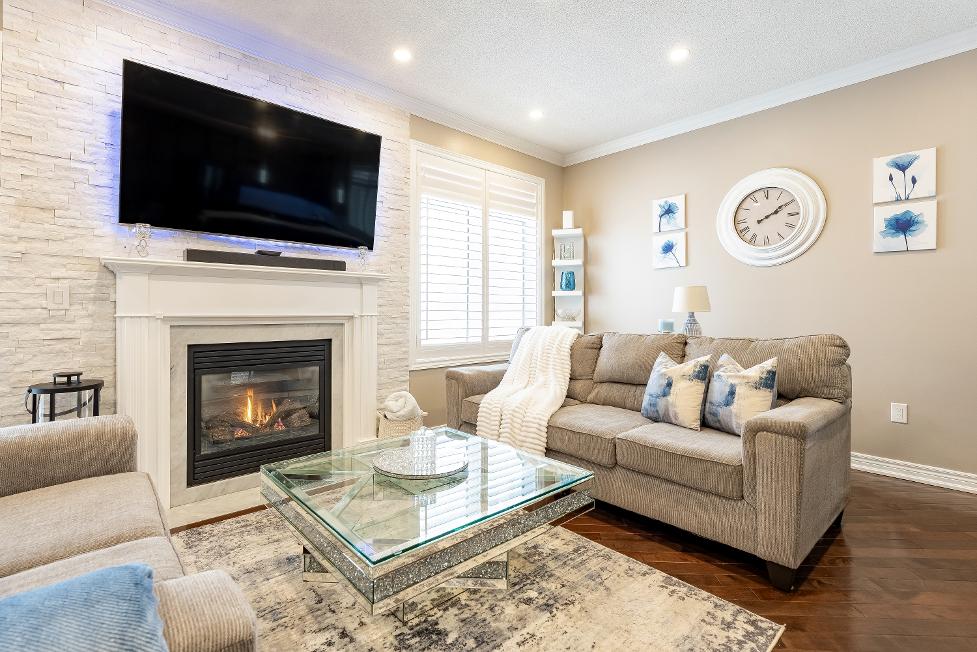 Designed forboth everydaycomfort and effortlessentertaining,the open-concept main living spacesfeelbright and welcoming with 9?ceilings,crown moulding,and California shutters,whilethe modern kitchen featuresquartzcountertops,a gasstove and a stylish coffee bar,along with a living room anchored bya stone-surround gasfireplace and patio doorsleading to the backyard