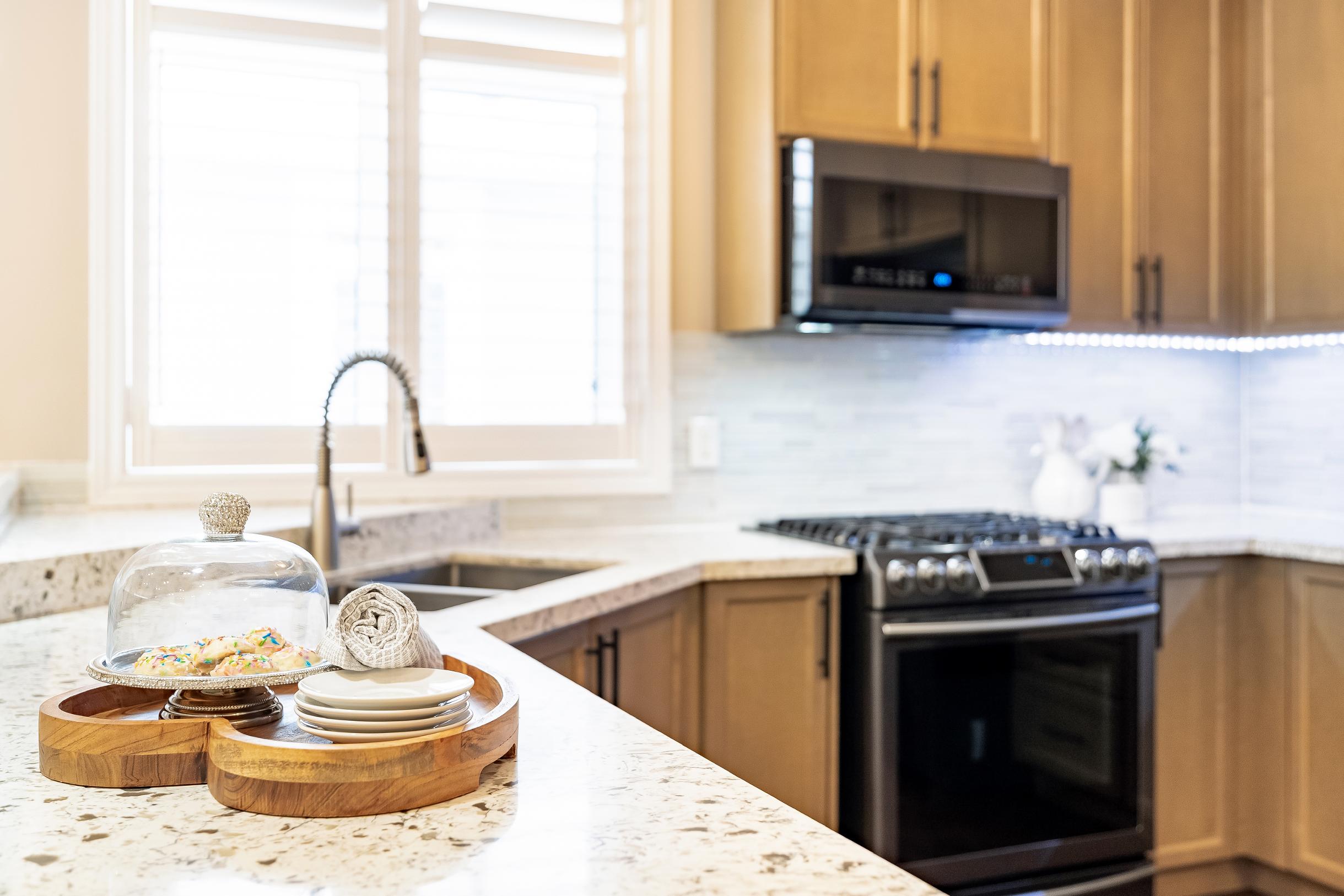 - Quartzcountertop complemented bya tiled backsplash illuminated by under-cabinet lighting