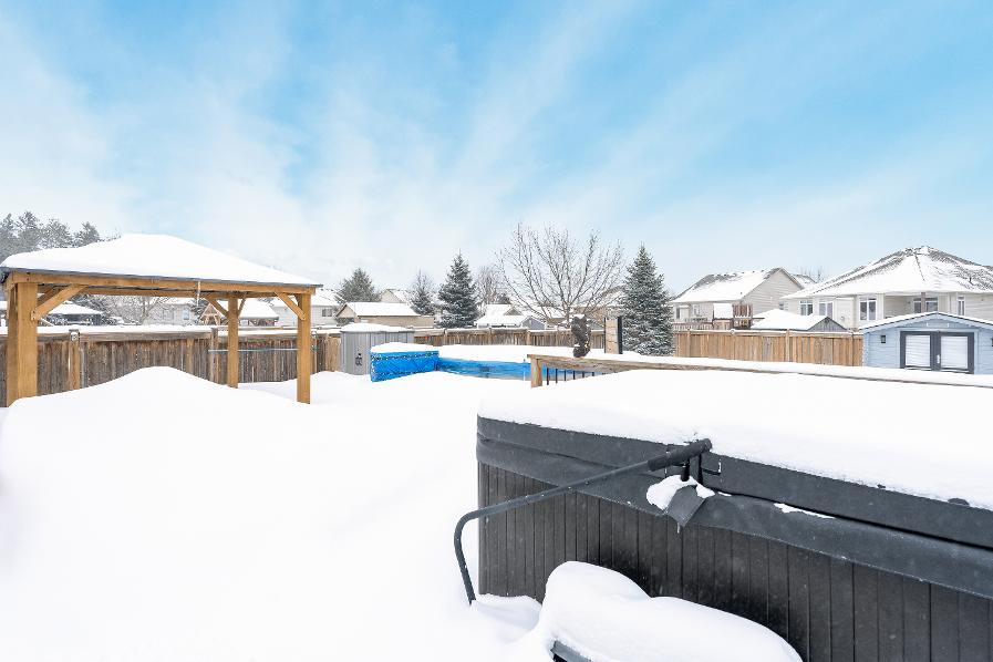 The fullyfenced backyard isa true show-stopperset on one of the largest lots,offering a multi-tierdeck,hot tub,above-ground poolwith a gasheater,a poolbar,a newgazebo,a 10?x11?shed,stone pathways,decorative rocklandscaping,and an underground sprinklersystem,creating an outdoorretreat made forentertaining and everydayenjoyment