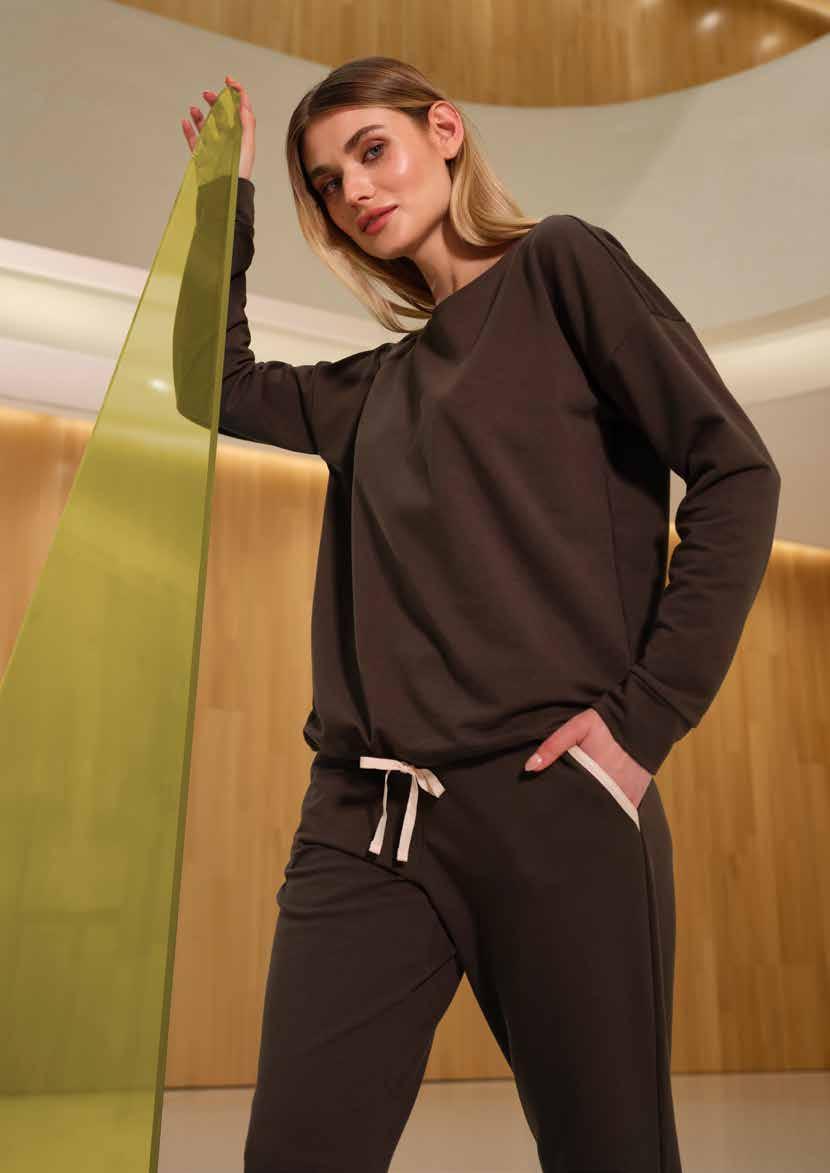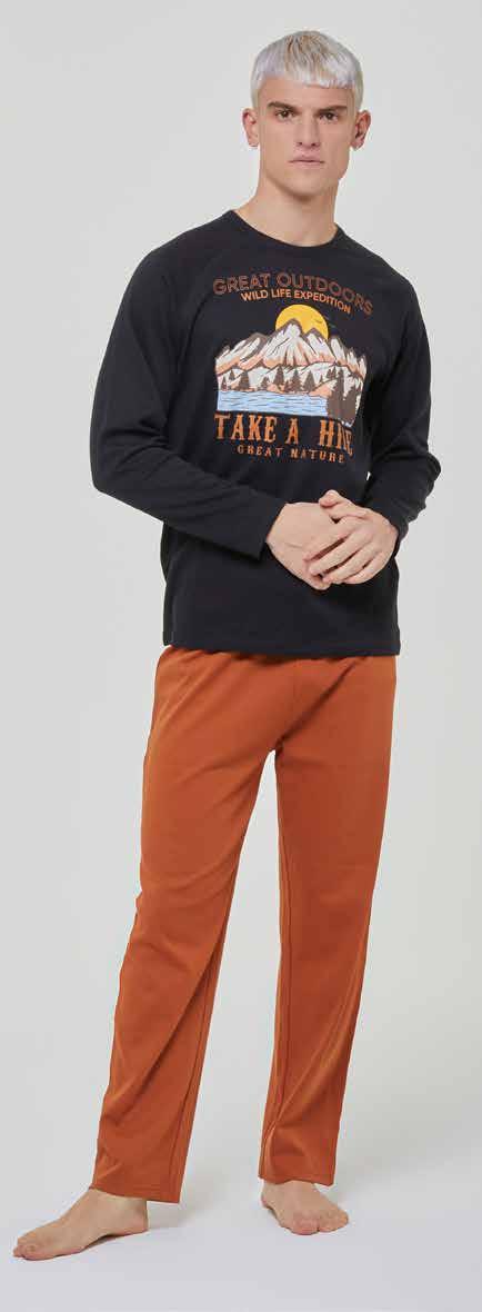 La collezione nightwear FW 2023 è ricca e articolata. Cotone interlock, jersey di viscosa, flanella di cotone, pile e micropolar effetto pelliccia o a costine sono alcuni dei tessuti scelti per gli articoli. La natura ispira la collezione FW 2023: nella serie uomo la palette riprende le calde tonalità della terra, mentre la linea donna propone le nuance delicate dei campi in fiore.