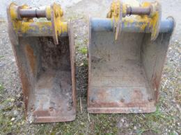 PAIR of older type (1960-ish) JCB 4-in-1 front bucket forklift tines, size 32" high x 44" long x 4" wide, c/w mounting brackets, retaining pins & round mounting rail, 84" long x 2" dia.
