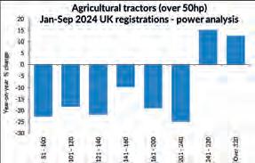 For the rst nine months of 2024, UK agricultural tractor registrations were 15% lower than in the same period last year. The number of machines registered in the third quarter was down by an even larger 20%, compared with a year earlier. AEA looks at how those trends varied by region and power band. These show that the number of tractors being registered this year has been lower across most of the power range. The exception is for the largest machines, over 240hp, where nearly 15% more have been recorded this year. That segment accounts for 16% of tractors registered this year, up from 12% in the rst nine months of last year. At or below 240hp (but over 50hp), 19% fewer machines were logged in January to September 2024 than in the same period last year.