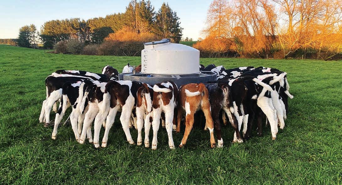 Daniel left school at the age of 14 without NCEA level 1. He has now completed NCEA levels 1 to 3 and recently completed an agribusiness financial management level 5 course. Calving begins August 7 and this season, 90 replacement calves have been kept. The calves tuck into breakfast.