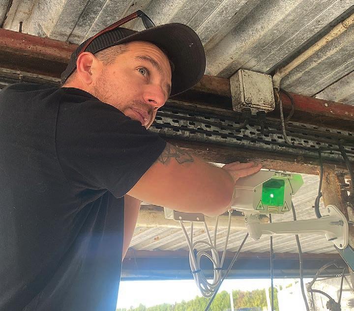 Birdscarer uses a high-speed scatter of laser light that disrupts the bird’s roosting location and is above people’s headspace. Liam Brown installs a Birdscarer in a dairy shed where birds are drawn to the leftover feed in the in-shed feeding system.